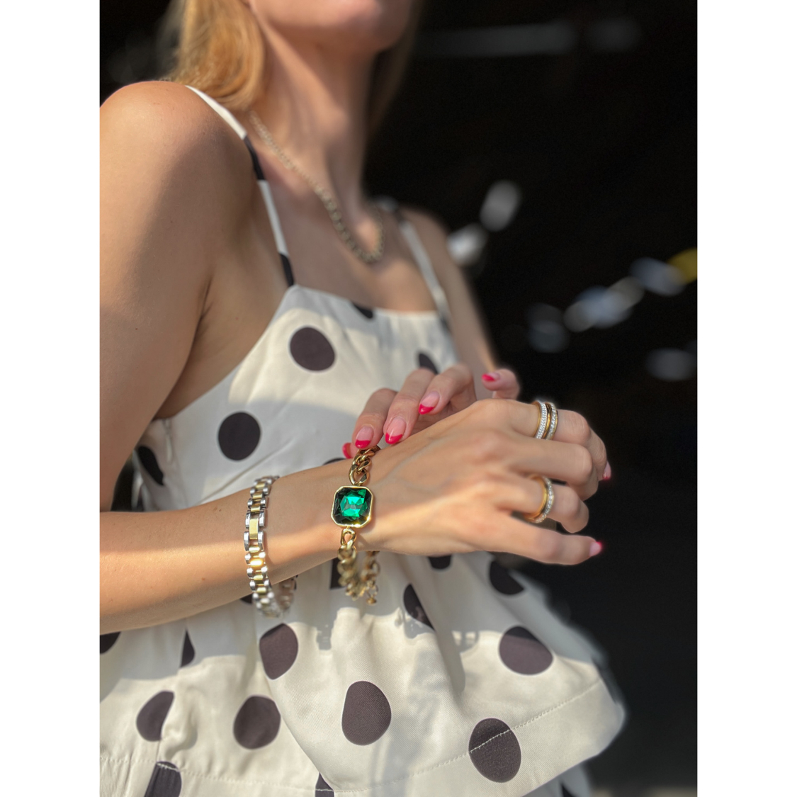 Gabbi armbånd i forgyldt med grøn sten fra LÉ MOSCH, panser statement armbånd med grøn sten, fyldigt og anderledes armbånd,