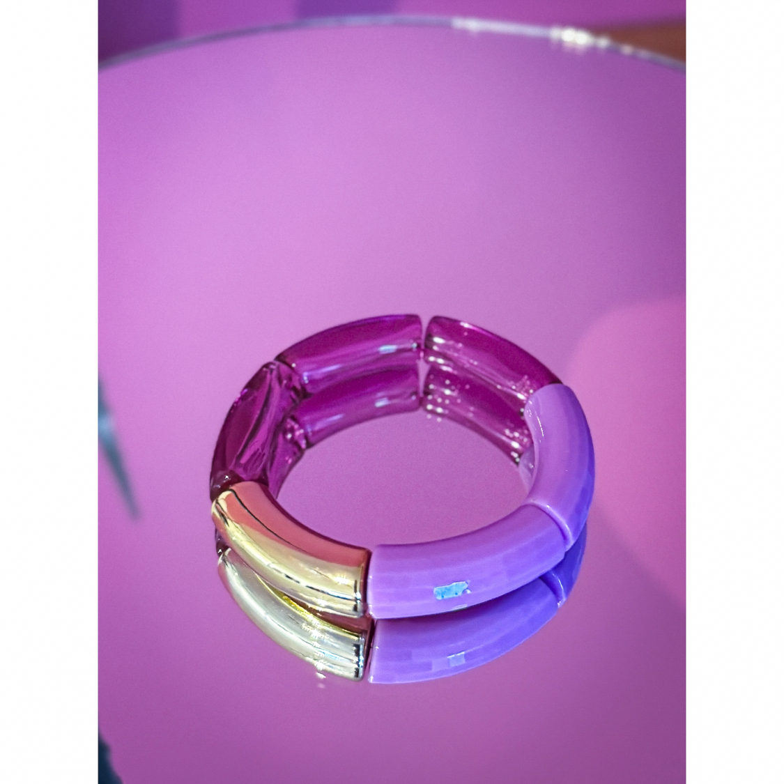 Lilla, kobber og guld farvet Xia armbånd fra  LÉ MOSCH – med natursten, vist på hånd.