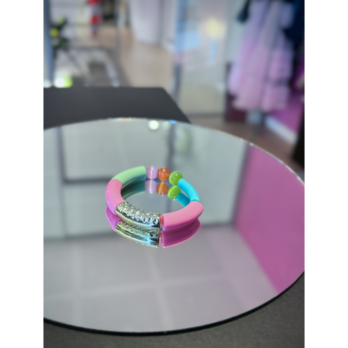 Maggie armbånd no 24 fra LÉ MOSCH, smukt boheme elastisk armbånd med tube perler i lyserød, mint og petroleumsgrønne nuancer sammensat med forgyldte perler fra le mosch