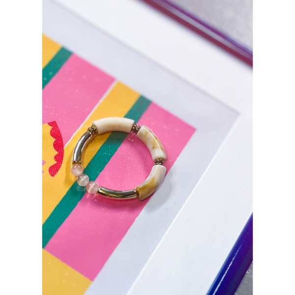 Hvid og guld farvet Xia armbånd fra  LÉ MOSCH – med natursten, vist på hånd.