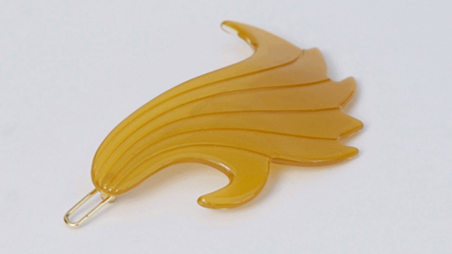 Mia tegnede en hurtig skitse af hårspændet bag på en kuvert, jeg tog et billede og skrev til Nicholas, at spændet skulle være karry-farvet, og med en lille kam på bagsiden til at holde håret. Og det skulle fremstilles af acetat, en slags bioplastik, som er super holdbart og bedre for miljøet end akryl.