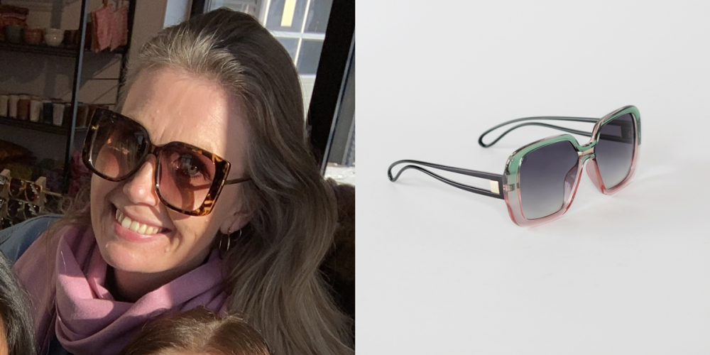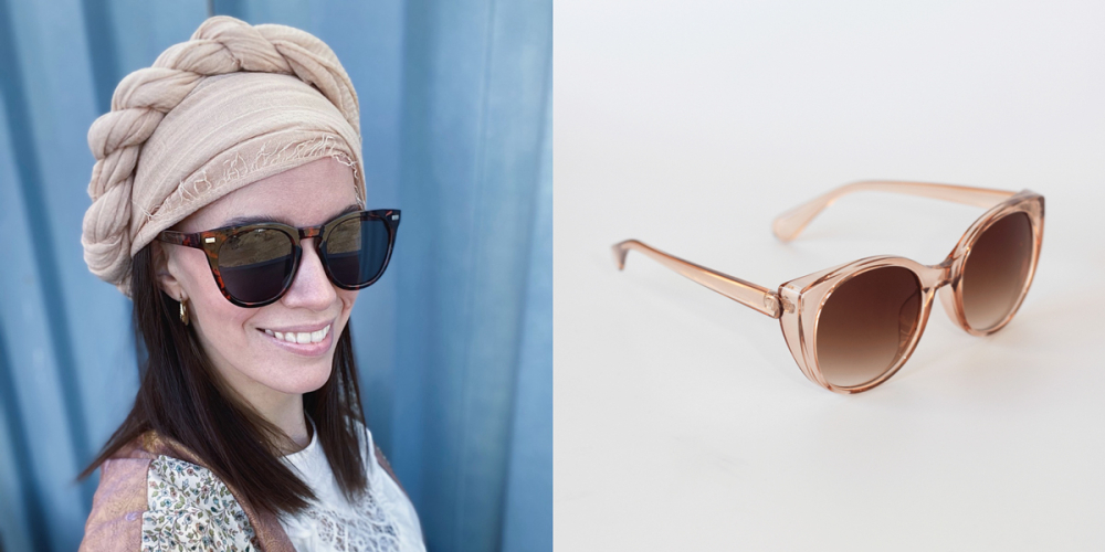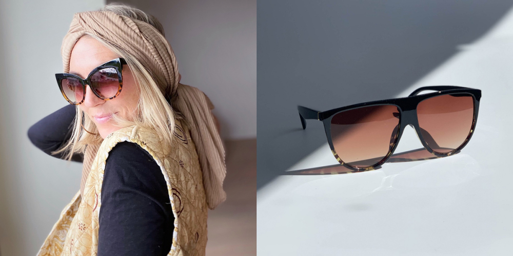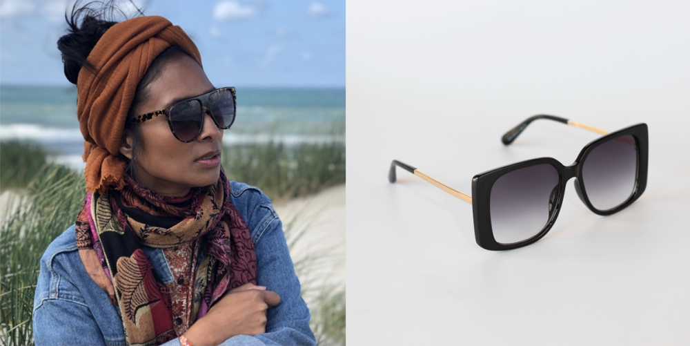 På billedet har Maria Feel me solbrillen i leo på, og ved siden af ligger Beate solbrillen i sort