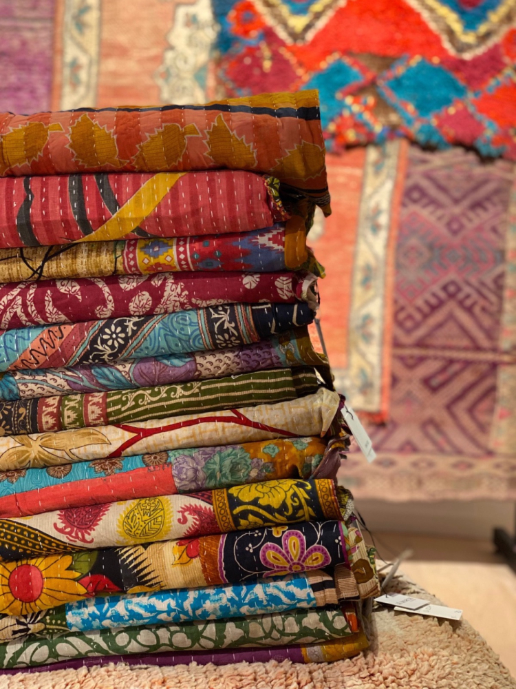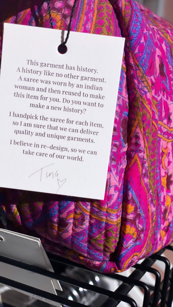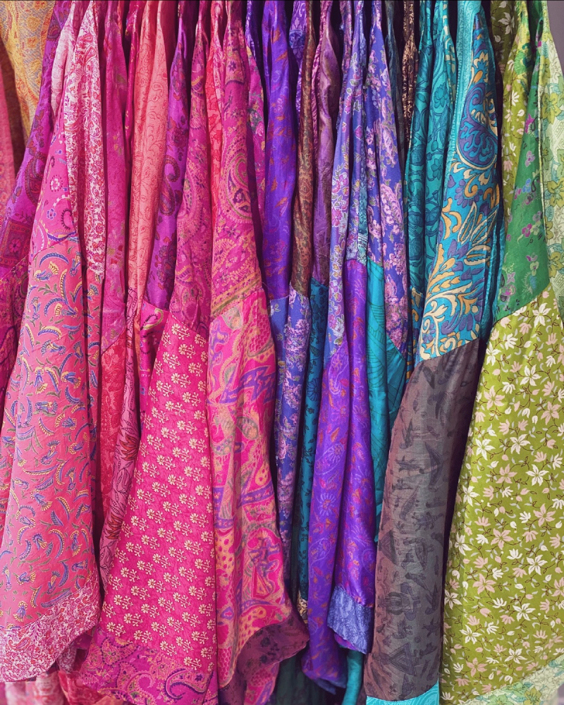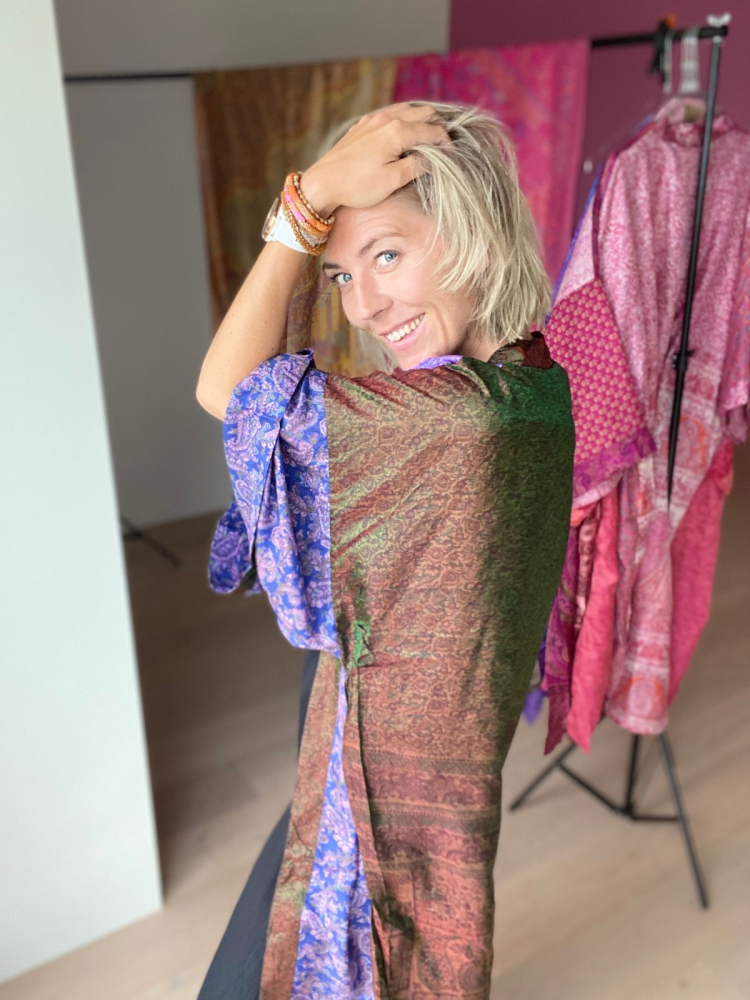 Derfor er vores kimonoer, veste og jakker lavet af vintage sarier fra Indien. De rester, der er tilbage, bruger vi til at lave tasker og tørklæder.