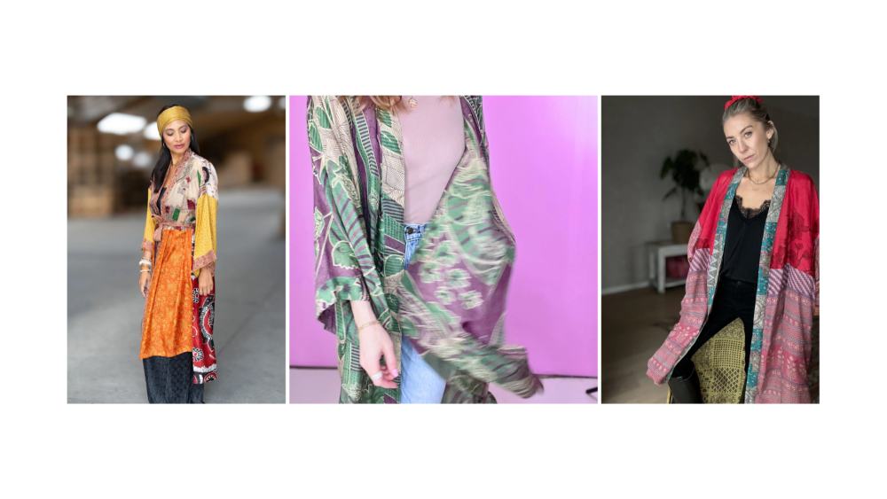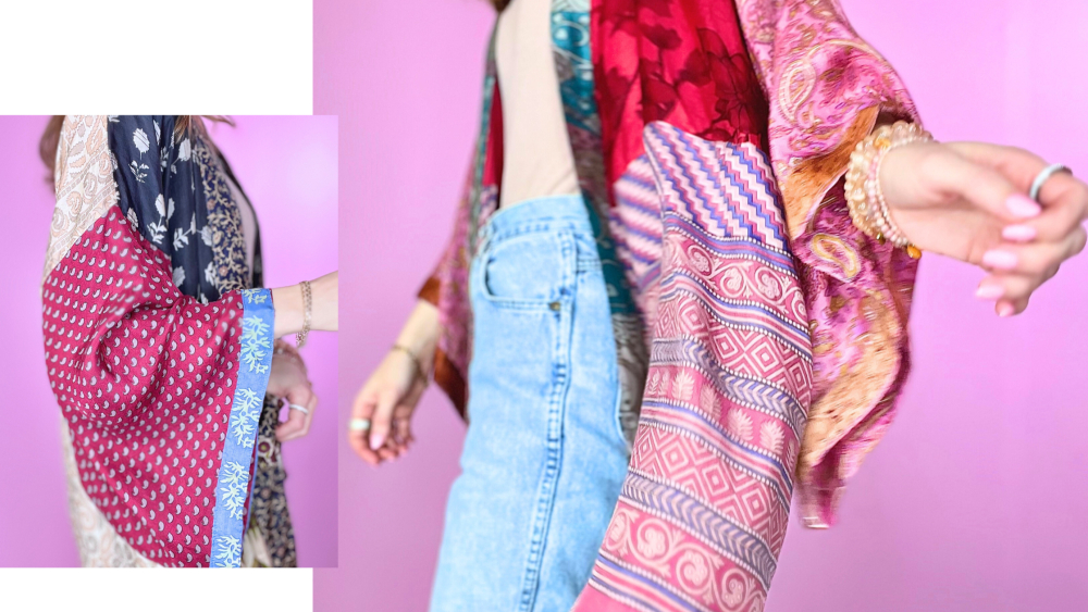 Begge kimono-modeller er syet af genanvendte indiske sarier, og det gør kimonoerne helt specielle og unikke. Og det er i sig selv en lille bonus, at vores kimonoer er unikke. Der findes kun én af hver. Du har derfor din kimono helt for dig selv. 💗