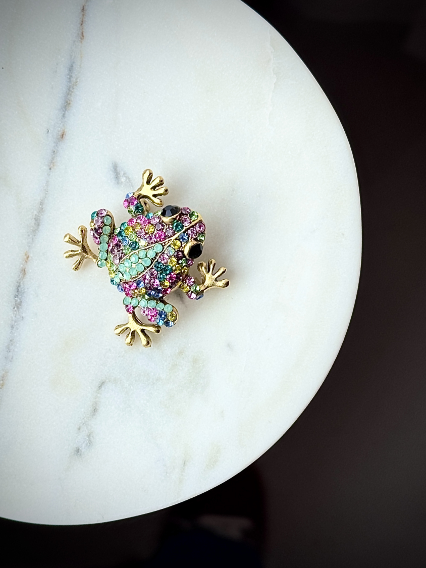 Smuk farverig frø-broche.