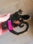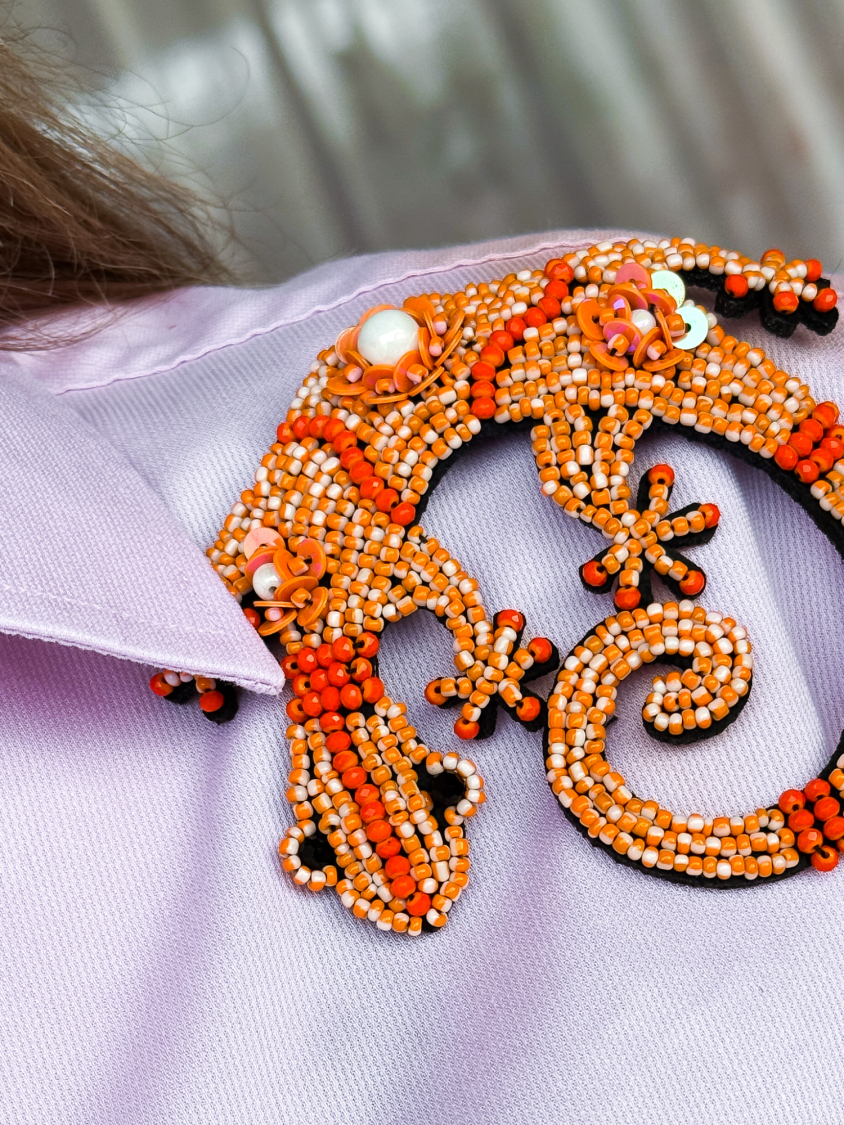 Broche med orange firben fra LÉ MOSCH, smuk og dekorativ stor broche med pailletter og perler, feminin og sjov broche der forestiller et firben,