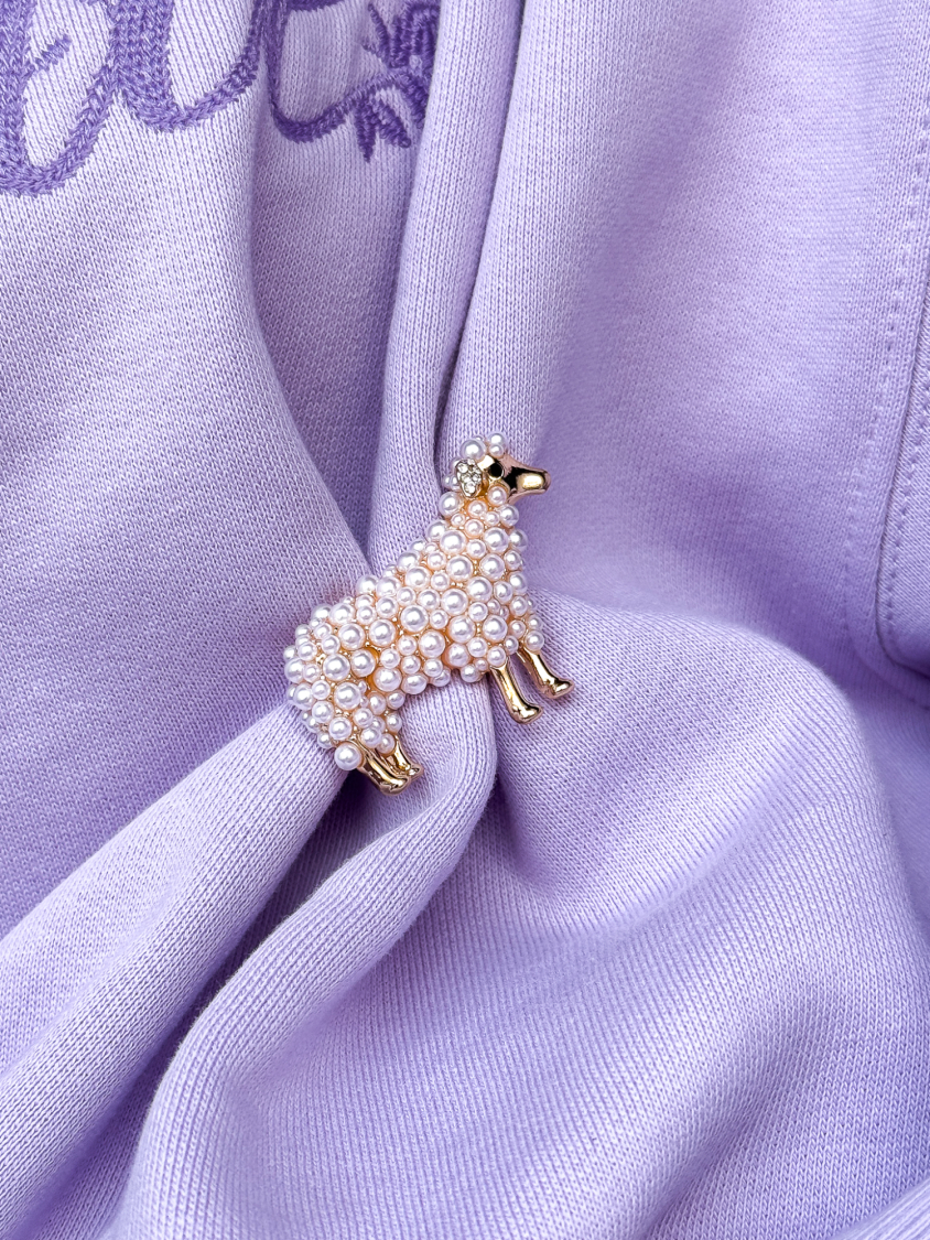 Får Broche med perler fra LÉ MOSCH, broche som forestiller et lille får, gylden broche med hvide perler,