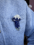 Lille Gople Broche i blå og hvid fra LÉ MOSCH, smuk og levende blå vandmand-broche, unik og dekorativ broche,
