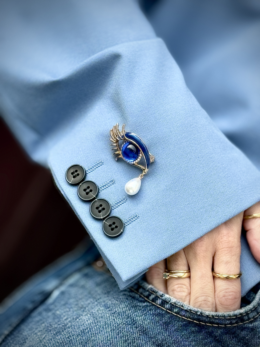 Øje Broche i blå med perle fra LÉ MOSCH, broche formet som et øje med en tåre, broche med hvid perle og blå sten,