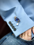 Smuk blå og gylden øje-broche med hvid perle.