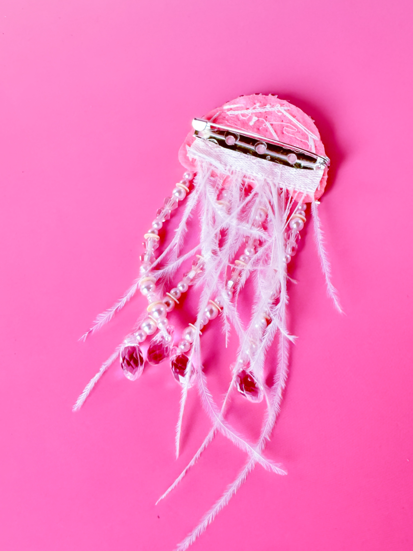 Rosa Gople Broche med perler, pailletter og fjer fra LÉ MOSCH, smuk og iøjnefaldende rosa broche, anderledes og fin broche der ligner en vandmand,