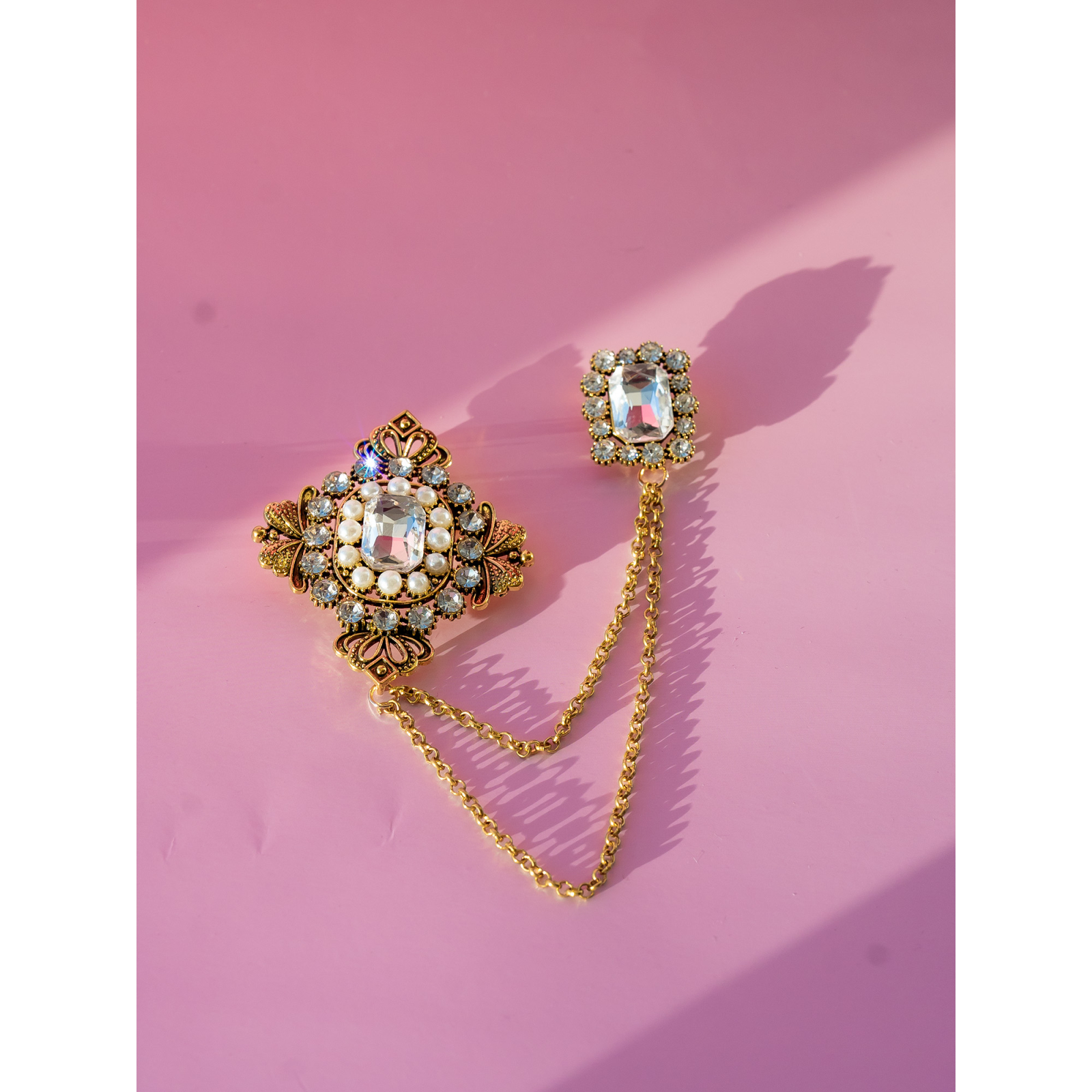 Denne her fine og fyldige "dobbelt-broche" er super dekorativ og kan bruges på mange måder. Dens vintagelook giver mulighed for en spændende styling, og den er ret nem at kombinere med andre brocher. Når der er kæder på brocherne bliver dit look mere spændende og "levende".