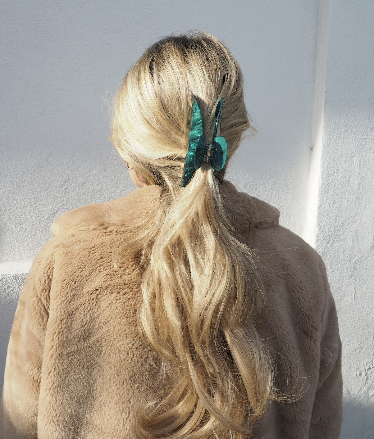 Har du let til fedtet hår, så kan du med fordel spraye tørshampoo i bunden og derfor tørre med hård varme med føntørren så det giver hold. Herefter samler du håret i nakken med Cloud hårklemme i Marmor Grøn så håret pjusker, og hurtigt har du den fienste sommer frisurer.
