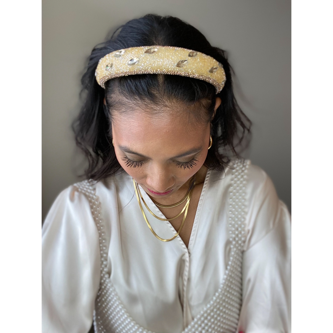 Mosaik hårbøjle med similisten og perler i Gylden