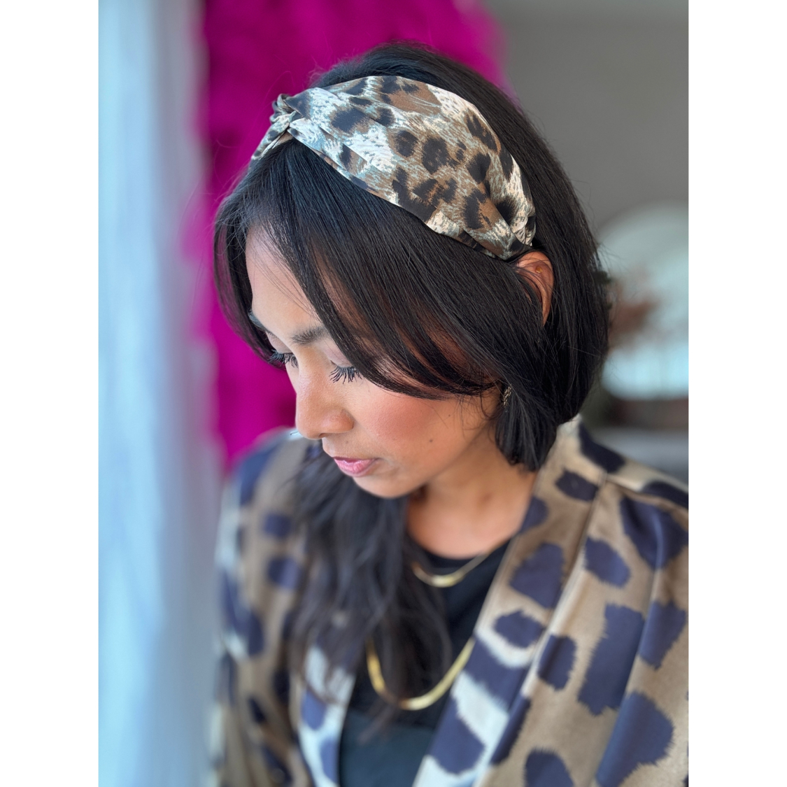 Hårbøjle i satin med leo print. Hårbøjlen er meget let og klemmer ikke bag ørerne. Bemærk, der er ingen reklamationsret på similisten.