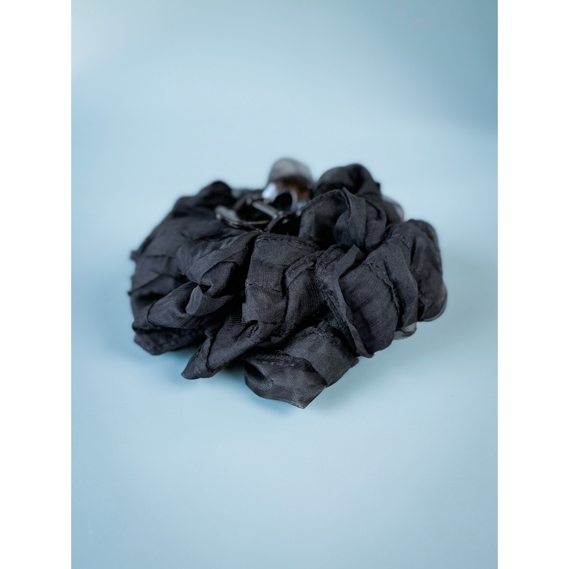 Hårklemme med sort fyldigt stof. Selve hårklemmen måler ca. 12,5 cm.