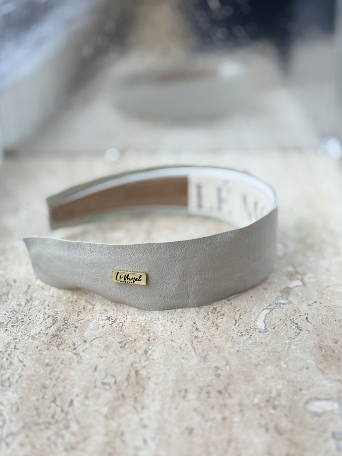 Flax flad hårbøjle med lysegråt læder fra LÉ MOSCH, cool og rå håndlavet hårbøjle, flad og preppy grå hårbøjle,