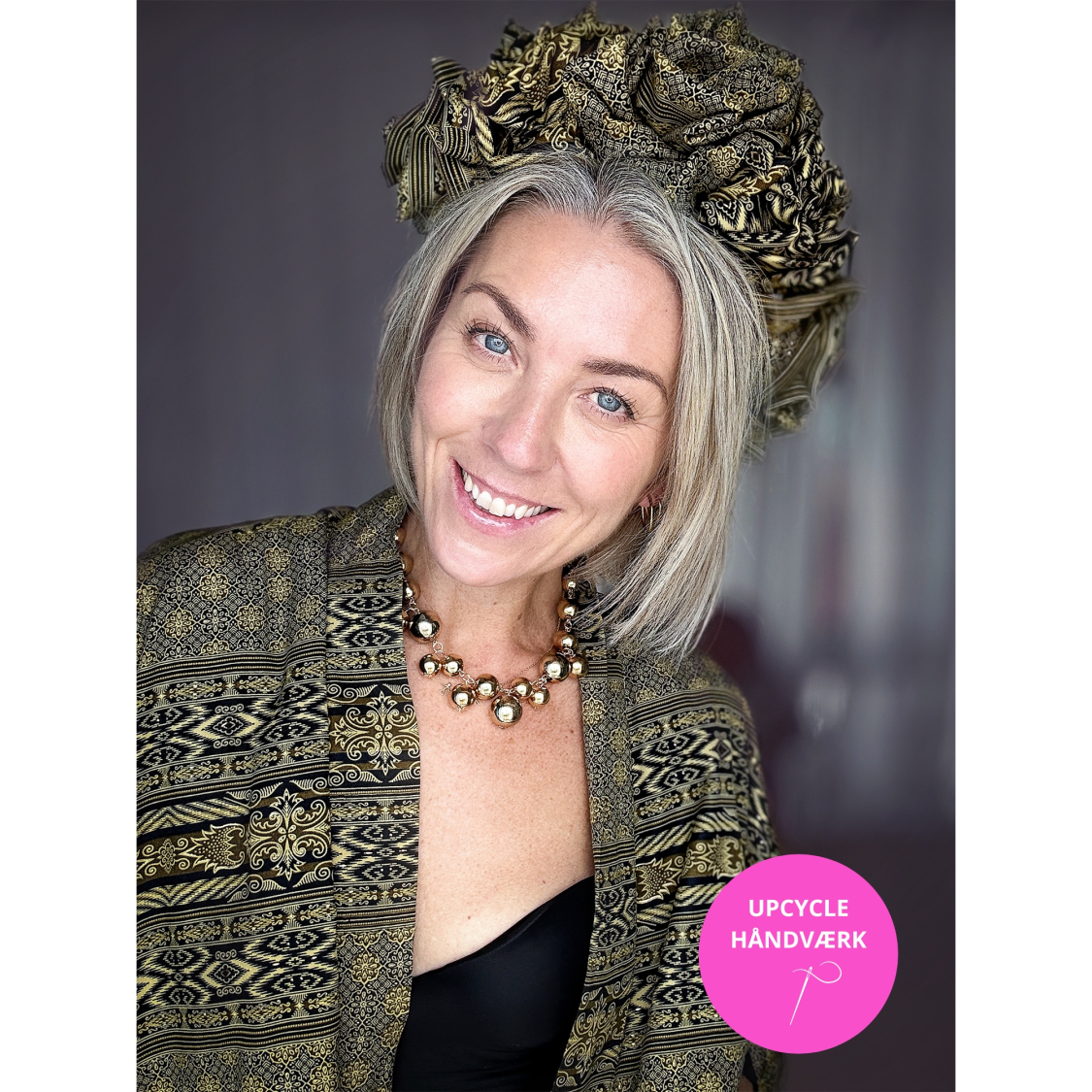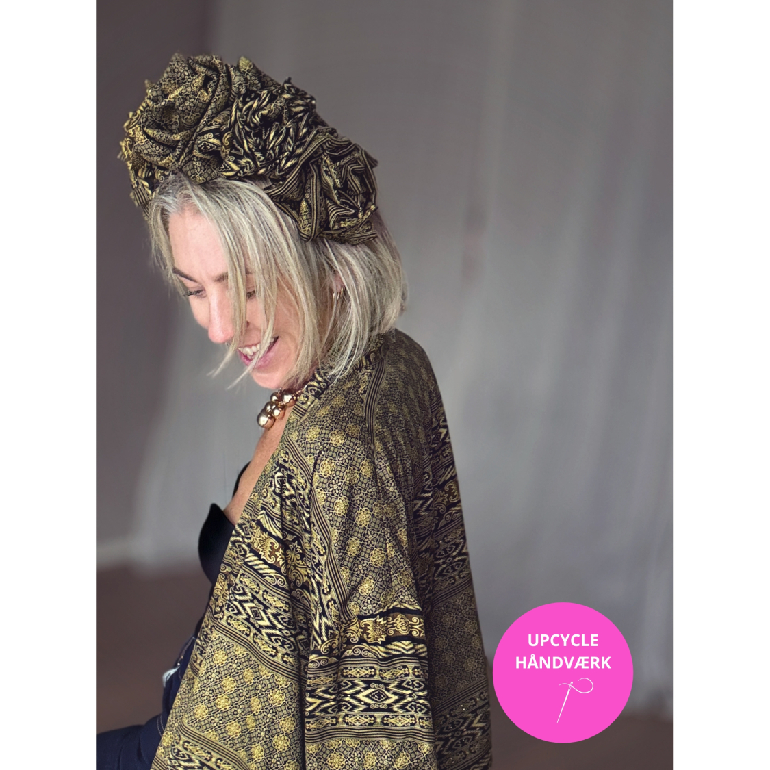 Håndlavet Maria Blomsterkrone hårbøjle no 2 i Sort og Army mønsterstof fra upcyclede kimonoer.