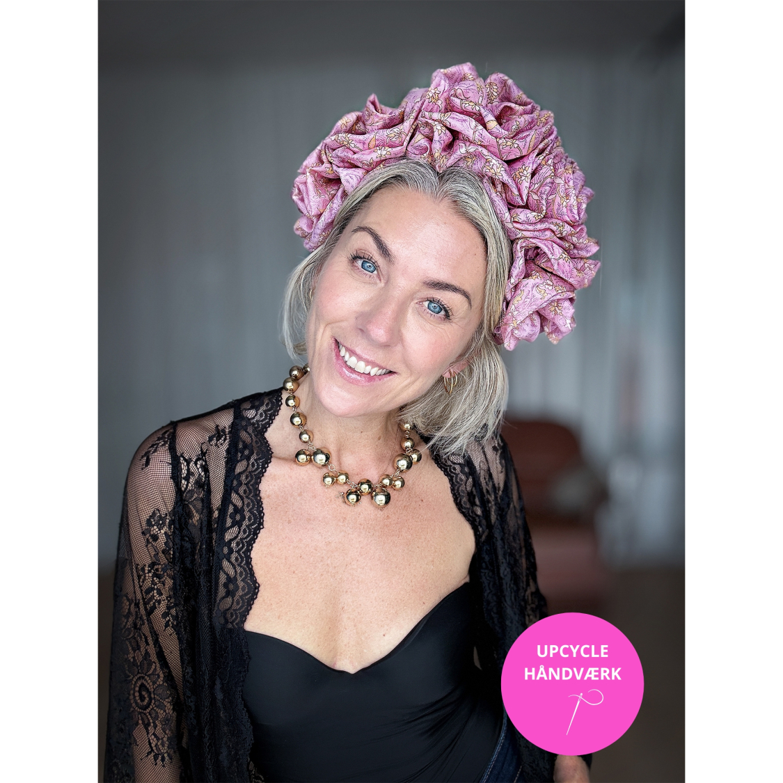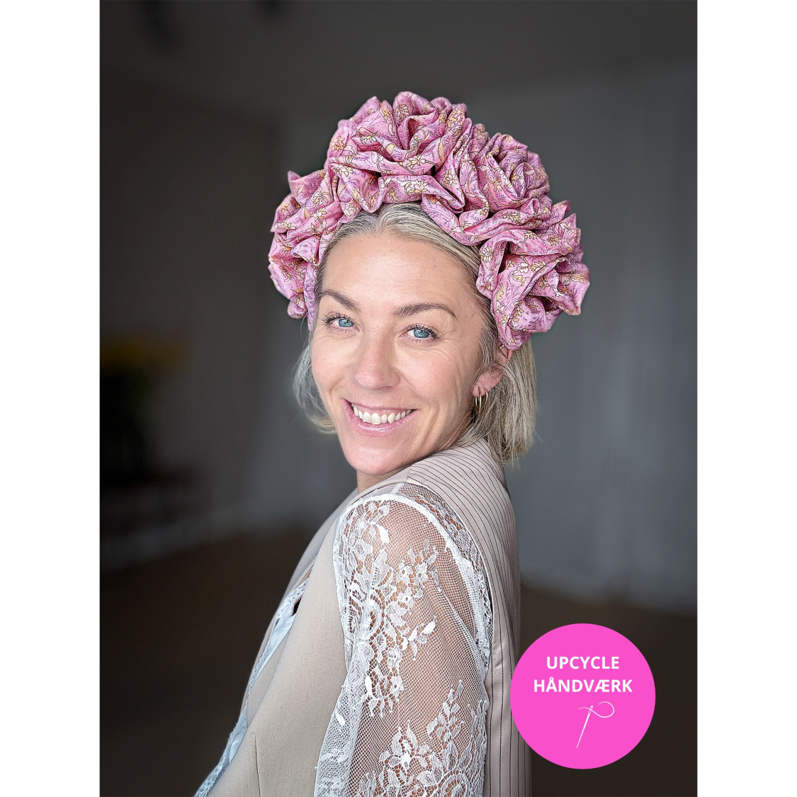 Håndlavet Maria Blomsterkrone hårbøjle no 4 i Rosa mønsterstof fra upcyclede kimonoer.