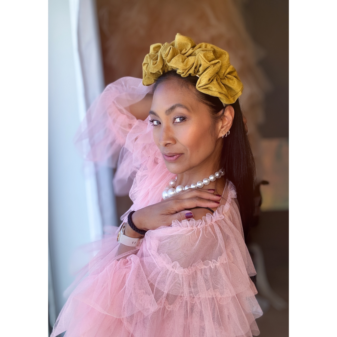 Stor asymmetrisk Midsommer hårbøjle i Karry fra LÉ MOSCH, fyldig hårbøjle med ruskindslook, festlig og fyldig hårbøjle,