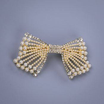 Varenr.: 2930321 | GTIN 5714441145408Smukt sløjfe hårspænde, besat med perler og similisten - ca. 8 cm. Selve spændet bagpå måler 4 cm. indvendigt.