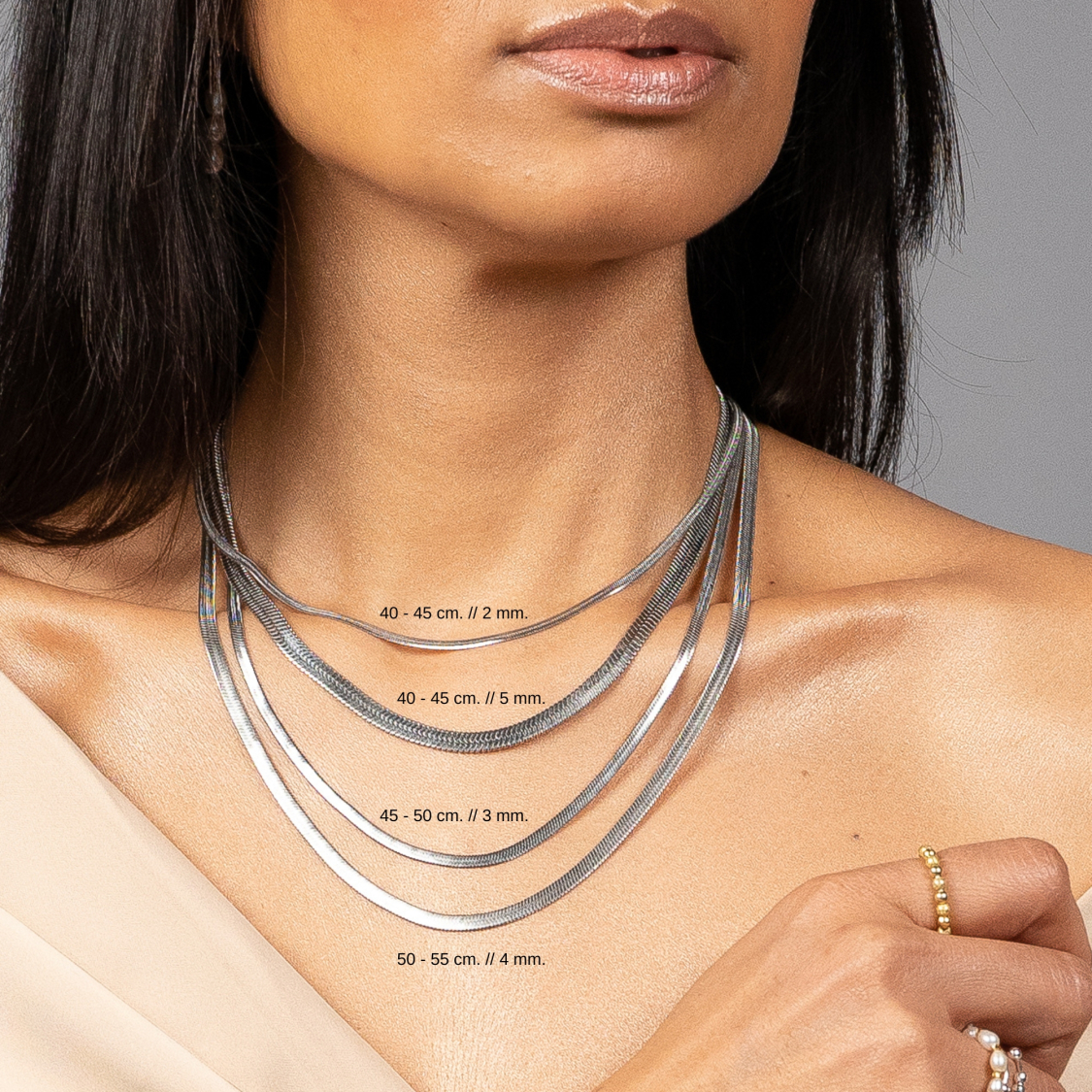 Smuk forsølvet halskæde. Flad slangekæde 4 mm bred. 50 - 55 cm. lang. Kæden er vandfast og du behøver derfor ikke tage den af i bad.