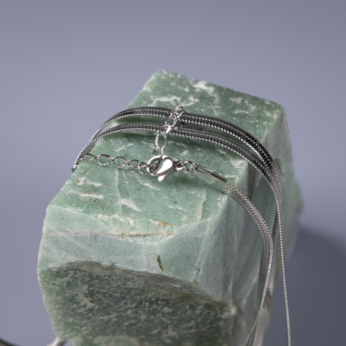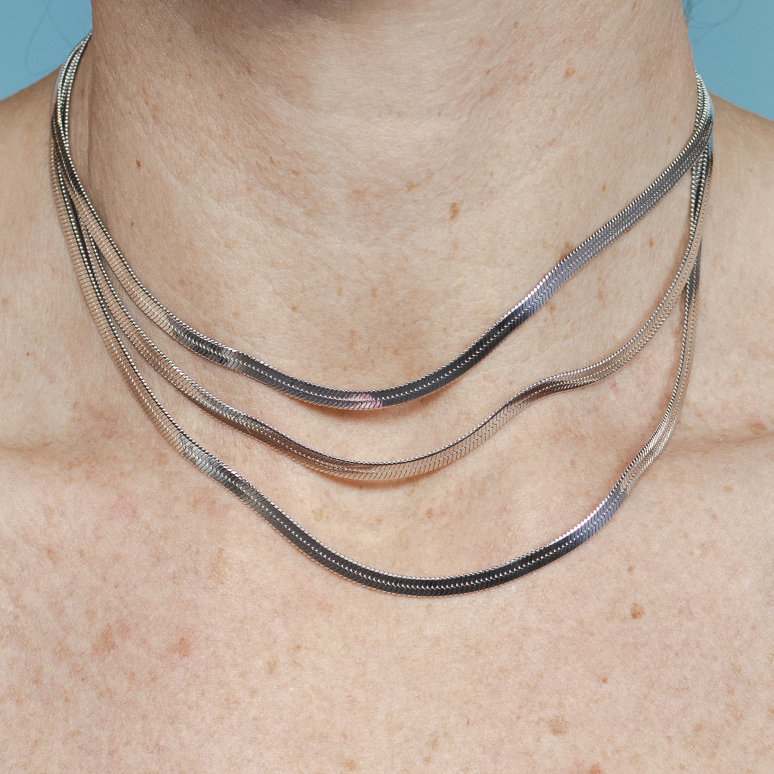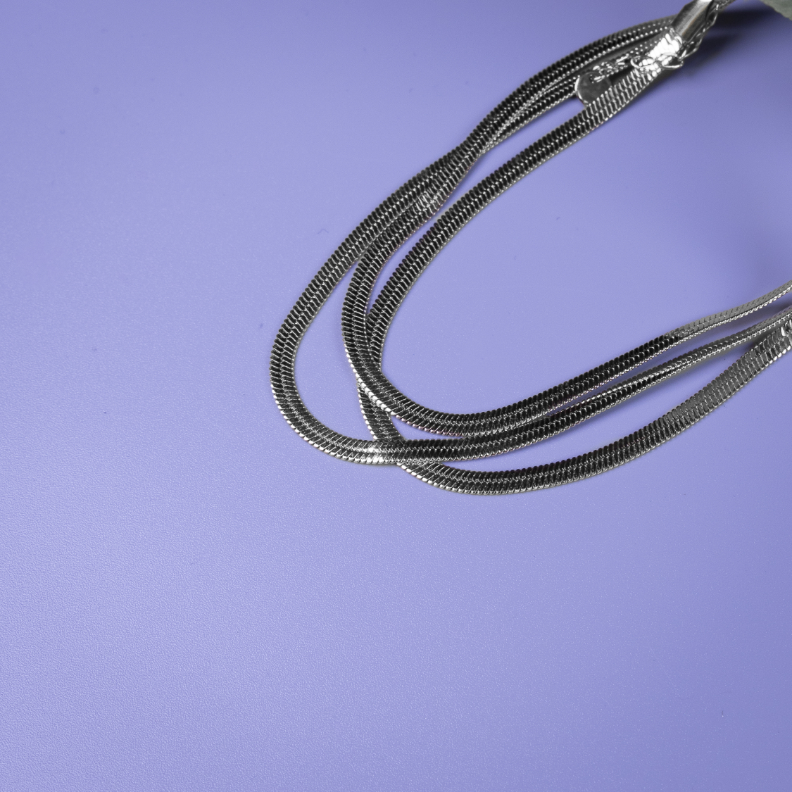 Smuk forsølvet halskæde. Flad slangekæde 4 mm bred og måler 110cm i lægden (+5cm i forlængelse). Kæden er vandfast og du behøver derfor ikke tage den af i bad.