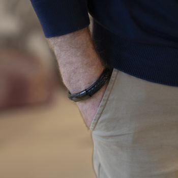 Det har to rækker. Den ene er flettet læder og den anden er lavasten. Læder og lavasten klæder hinanden super godt. Det har en fed rå vibe over sig og det er en af de kombinationer vi bedst kan lide. Hvis du ønsker et armbånd der ikke kun er læder, men stadig ikke skal være alt for meget med natursten, så er lavasten en rå underspillet natursten, som ikke falder for meget i øjnene sammen med den sorte læder. De to materialer spiller rigtig godt sammen, og det er et virkelig fedt armbånd!