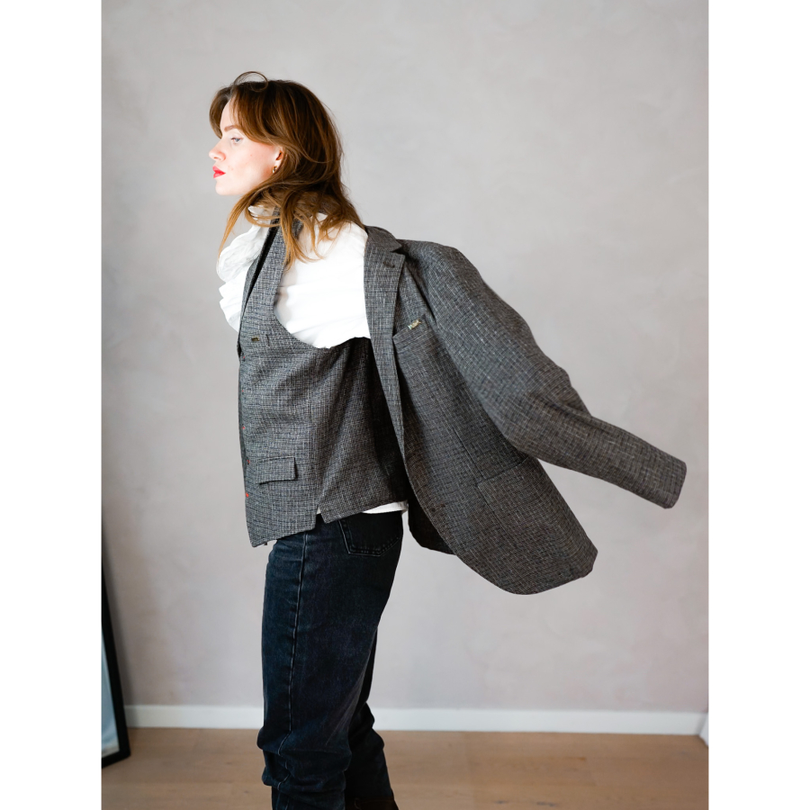 Vintage Vibes sæt med blazer og vest – No 152 fra LÉ MOSCH, skønt sæt i fine brune tern,  unikt og anvendeligt sæt med blazer og vest,