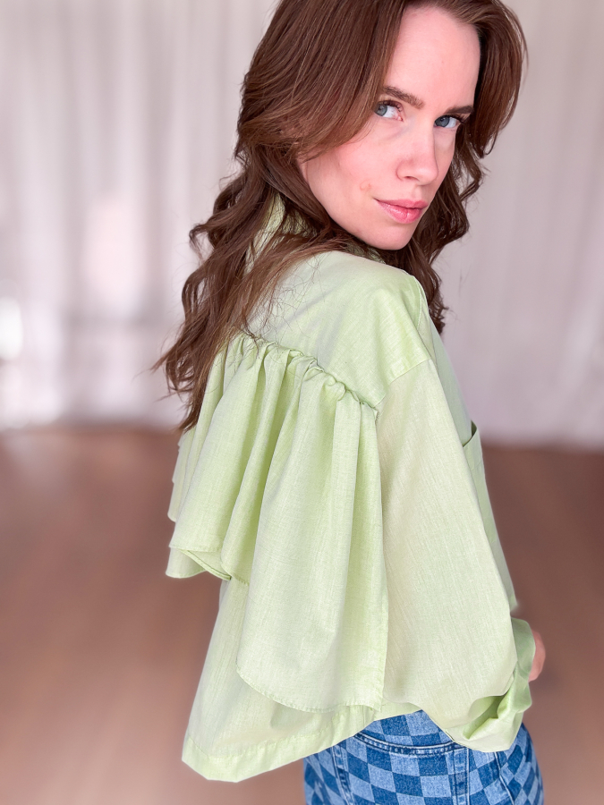 Vintage Vibes grøn skjorte med flæse og patch - No 179 fra LÉ MOSCH, Smuk og anderledes limegrøn skjorte, skjorte med flæse og patch på ryggen,