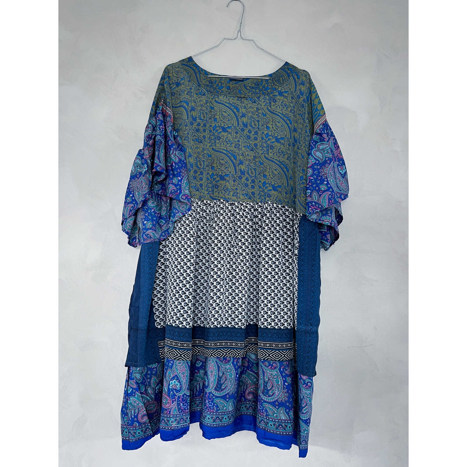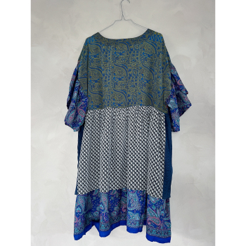 Kjolerne er lavet af vintage sarier og du vil derfor opleve at der kan være små brugsfejl, hvilket vi bare synes er en del af charmen. Ved at købe de her fine kjoler er du med til at støtte små familier i Indien. Vi synes historien er yderst fin og vi elsker at kunne upcyckle produkter til endnu finere ting, så som kimonoer, tæpper, puder, tasker og kjoler.