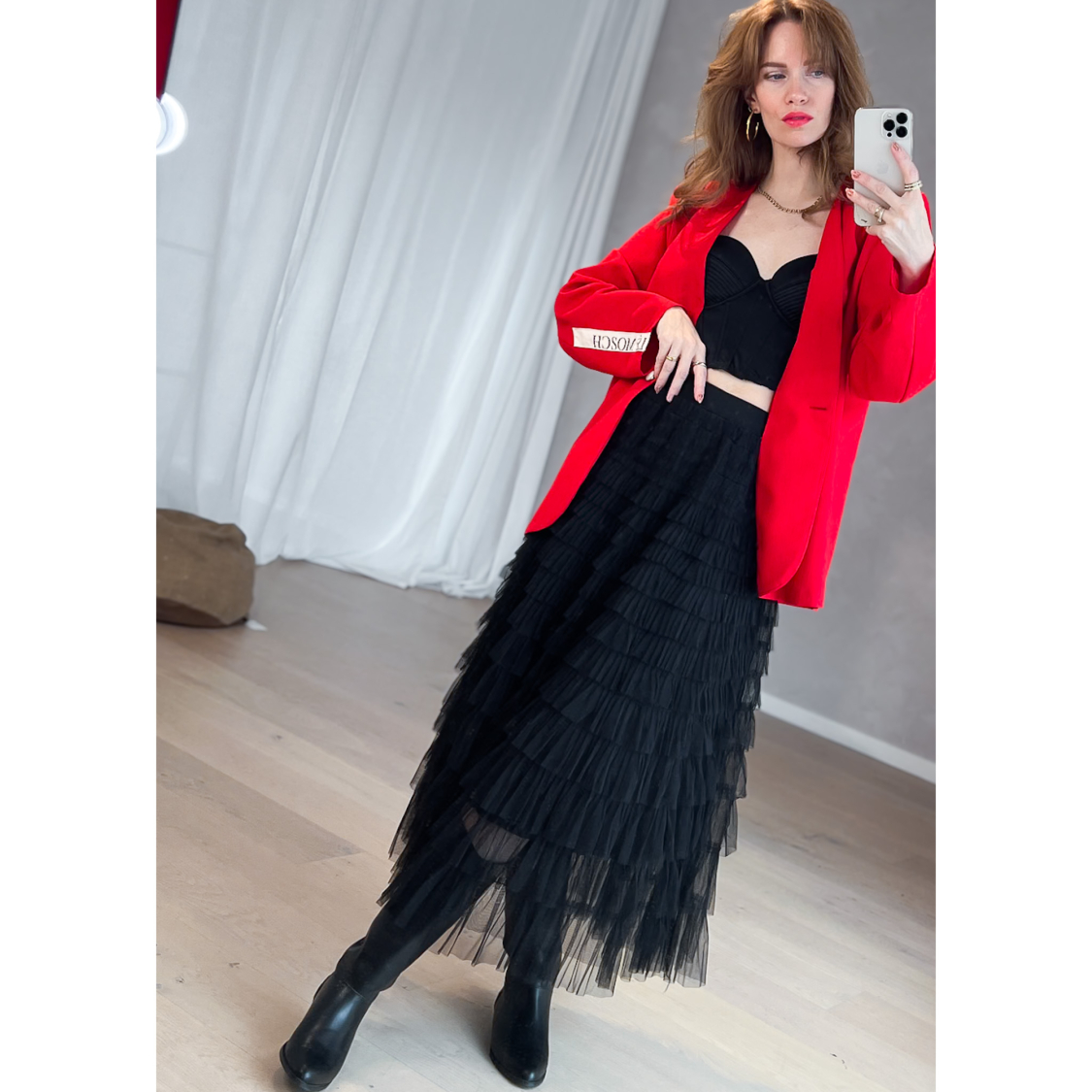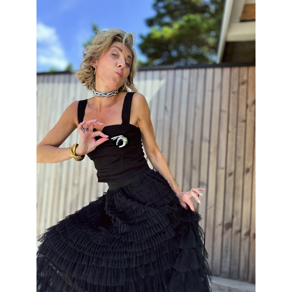 Sort blonde slå-om nederdel stylet over lyse bukser – feminin og cool style fra Lé Mosch