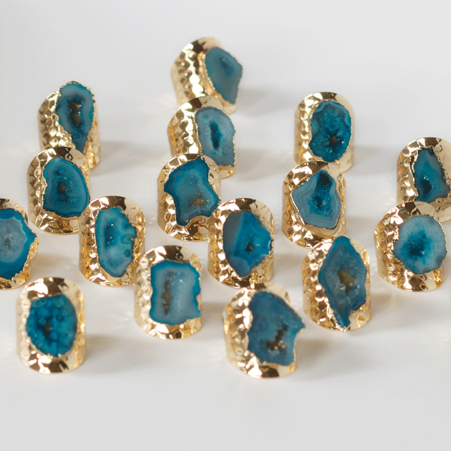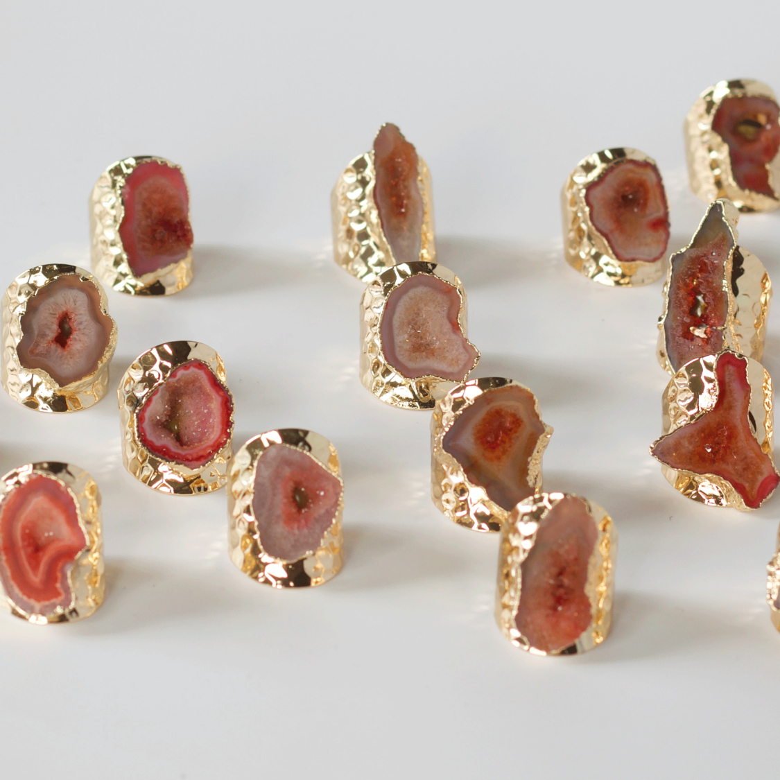 Ring i natursten med forgyldning. VIGTIGT. Den ring du får vil være unik. Den vil være i den brændte farve, men der vil være farveforskelle samt størrelses forskelle. Hvilket du også ser på billedet. Det vil ikke være muligt at udpege en ring ud fra billedet du ser - men altså kun kunne se farven på ringen. bemærk der er huller i stenene så man på nogle af dem kan se bagsiden af ringen. se billede.