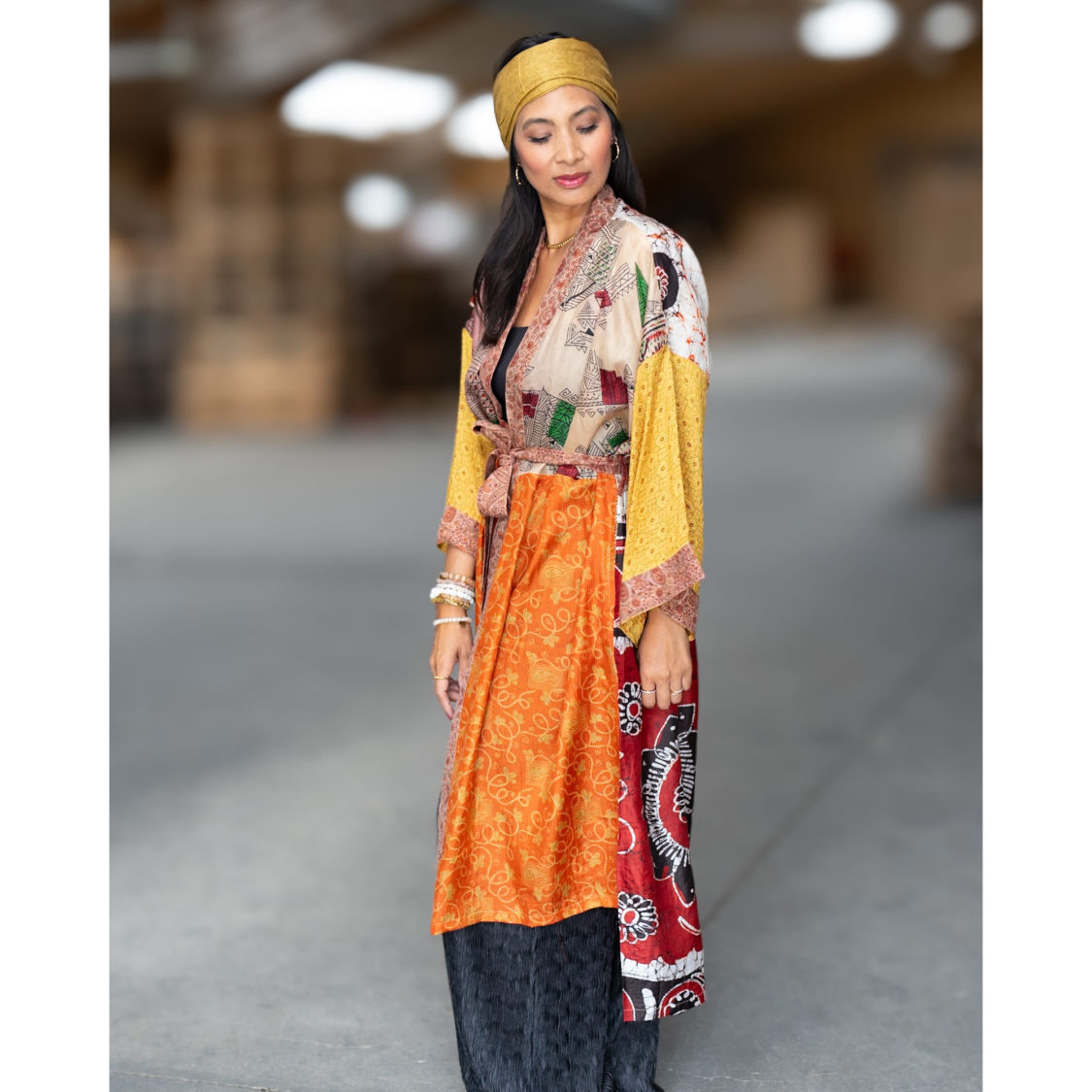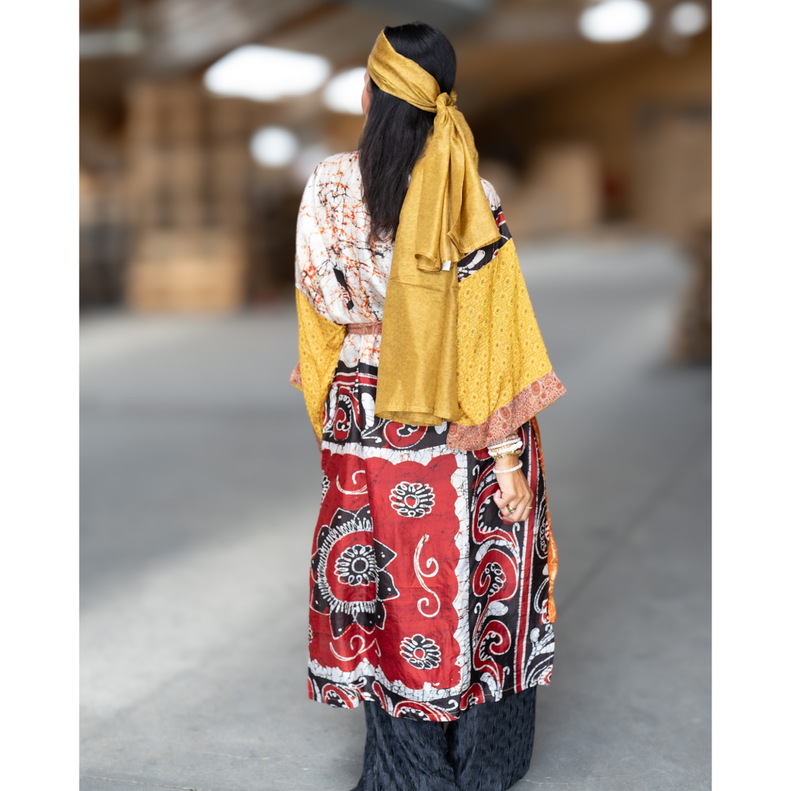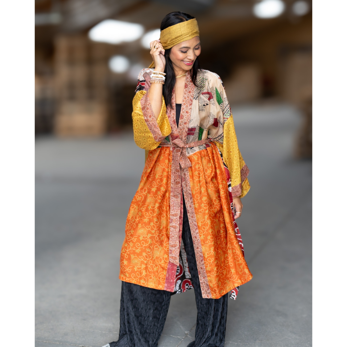 Monya Silkemix kimono no 1700 i gul. Håndlavet silkemix kimono i vintage sarier - kun 1 stk. af hver! Hurtig levering