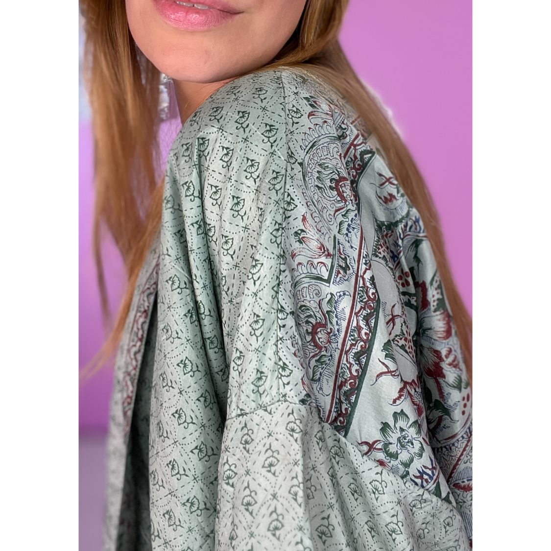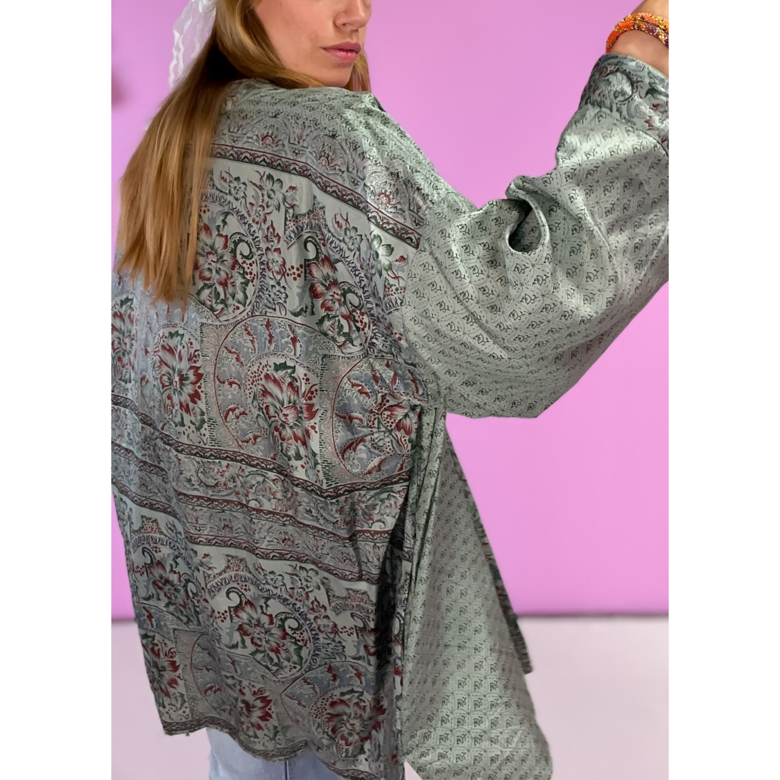 Monya Silkemix kimono no 1716 i Støvet Grøn. Håndlavet silkemix kimono i vintage sarier - kun 1 stk. af hver! Hurtig levering