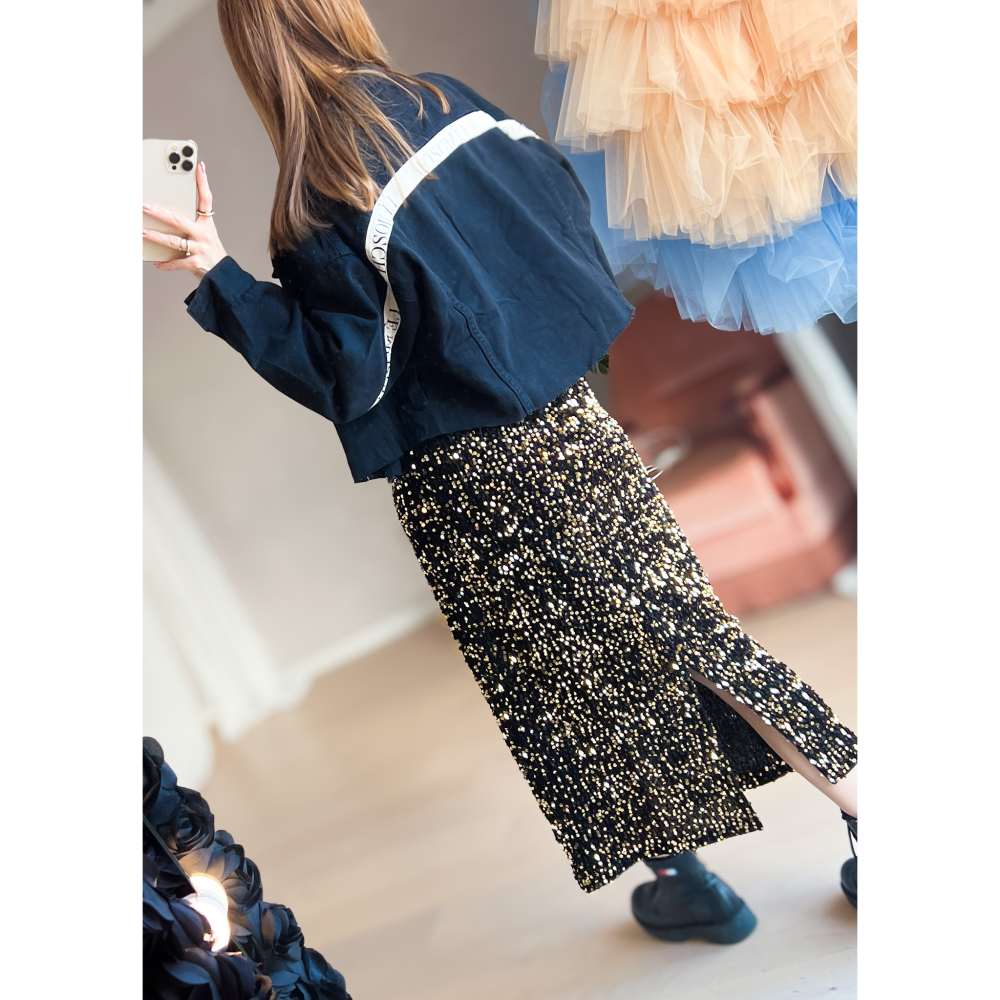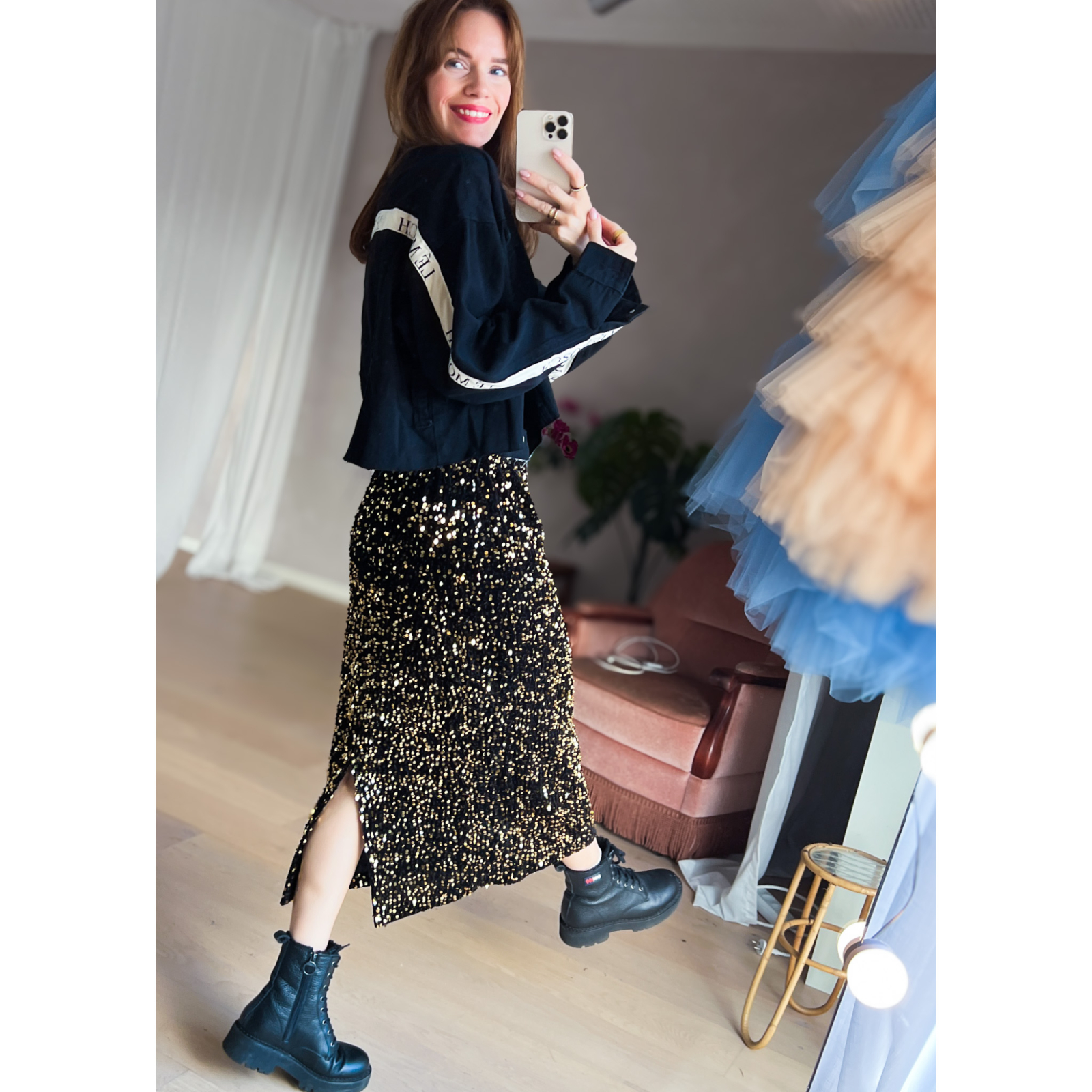 Vi er ret glade for glimmer, glitter og pailletter. Og derfor er vi også begejstrede for denne er super dejlige og festlige nederdel med pailletter. Den er helt perfekt til de kommende måneder! Stoffet er blødt og strøet med pailletter i alle mulige farver.