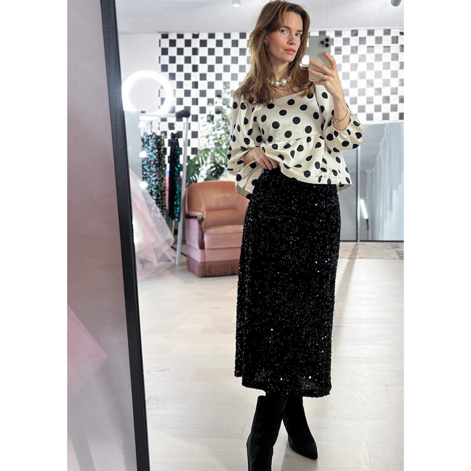 Vi er ret glade for glimmer, glitter og pailletter. Og derfor er vi også begejstrede for denne er super dejlige og festlige nederdel med pailletter. Den er helt perfekt til de kommende måneder! Stoffet er blødt og strøet med pailletter.