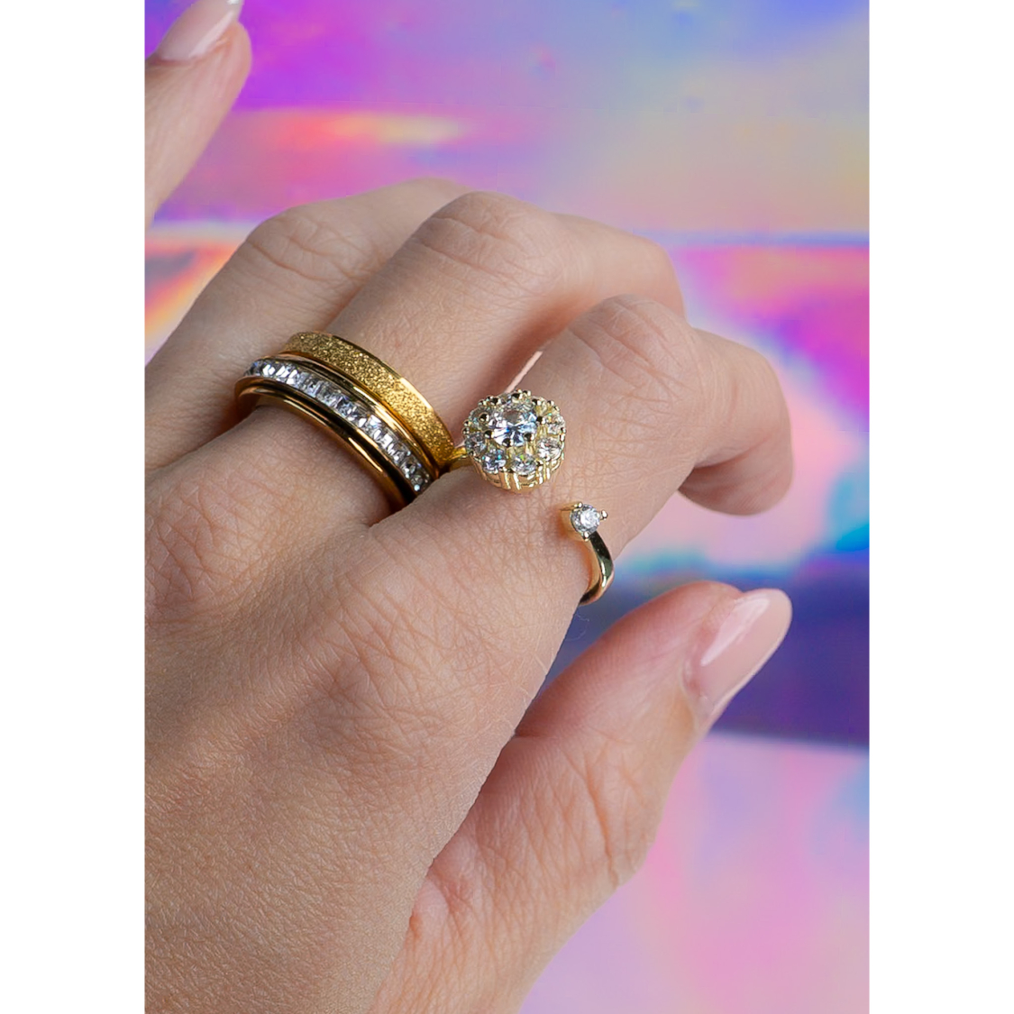 3 anti-stress ringe i guld fra LÉ MOSCH – én med sten og to med drejefunktion.