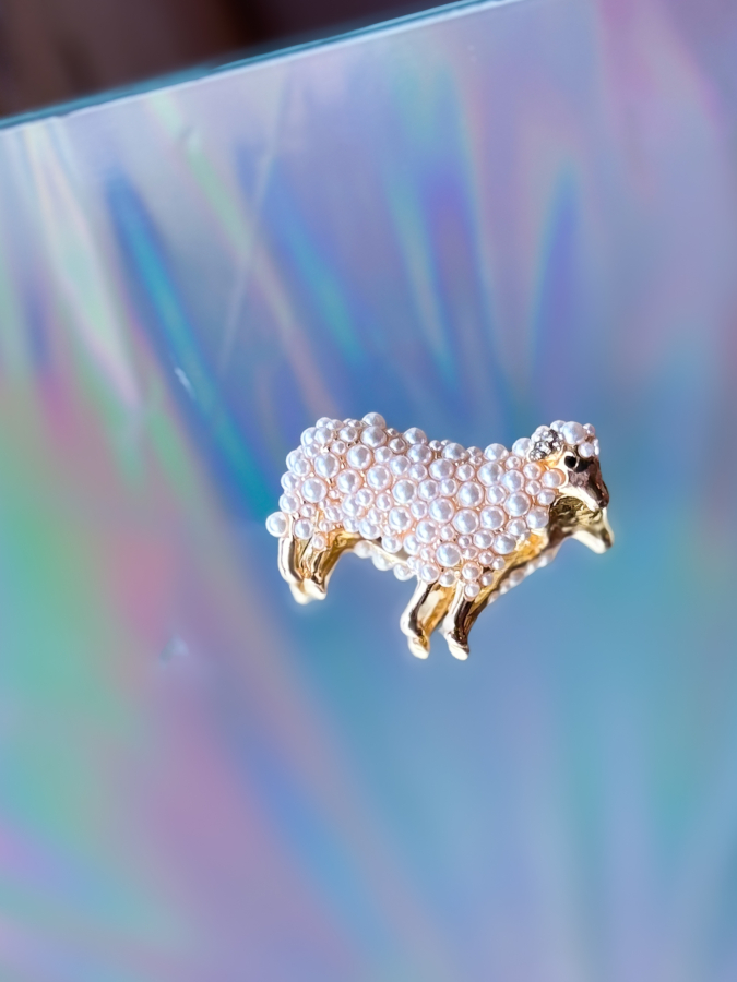 Får Broche med perler fra LÉ MOSCH, broche som forestiller et lille får, gylden broche med hvide perler,