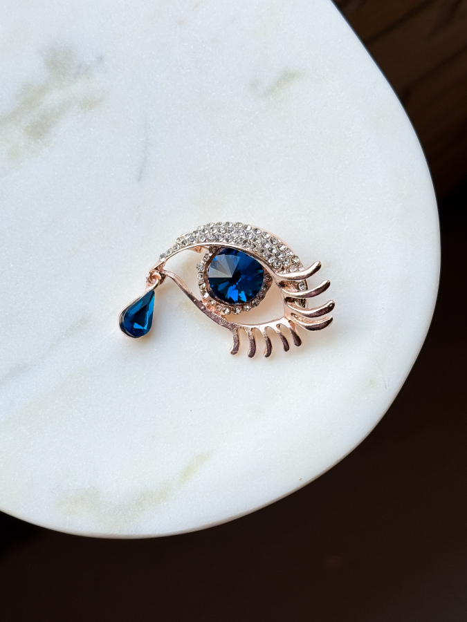 Rosa Gylden Øje Broche med turkise sten fra LÉ MOSCH, broche formet som et øje med en tåre, smuk rosa broche med blå sten,