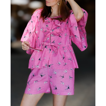 Blusen er syet i 100% bomuld og er dermed en let og behagelig bluse. Den bindes foran med 3 sæt bånd som skaber fine sløjfer. Du kan også vende blusen om, så sløjferne sidder på ryggen, for at variere dit look lidt.