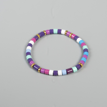 Armbåndet er lavet af metalperler i skønne farver, på en elastiksnor.
