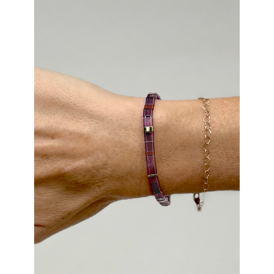 Lilla, kobber og guld farvet Xia armbånd fra  LÉ MOSCH – med natursten, vist på hånd.