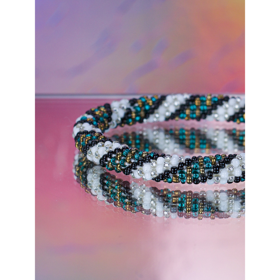 Håndbroderet Nepal Armbånd med Perler i Hvid, Sort, Turkis  og Guld fra LE MOSCH
