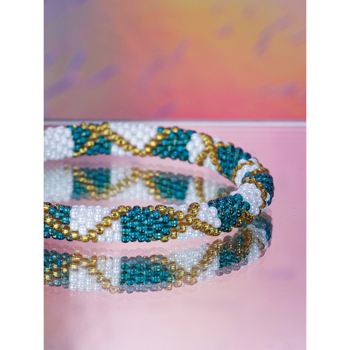Håndbroderet Nepal Armbånd med Perler i Hvid, turkis og Guld fra LE MOSCH