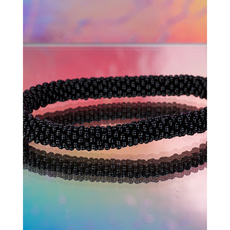 Armbånd med perler, som skal rulles på armen, så de passer til de fleste håndled. Måler 6 cm i diameter. Vi har altid 3 for 300. Rabatten trækkes automatisk i kurven.