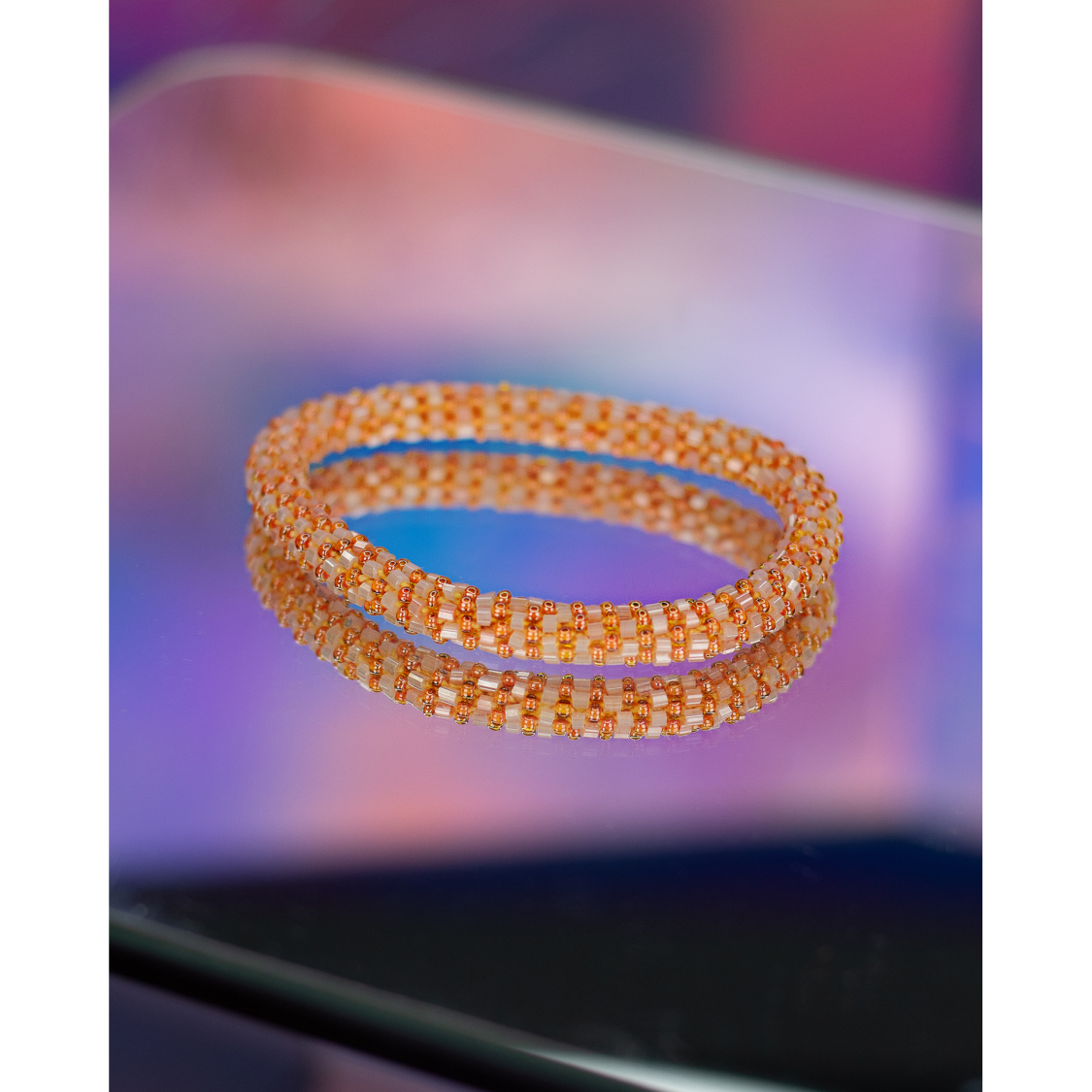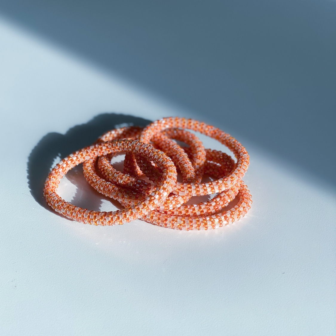 Armbånd med perler, som skal rulles på armen, så de passer til de fleste håndled. Måler 6 cm i diameter. Vi har altid 3 for 300. Rabatten trækkes automatisk i kurven.