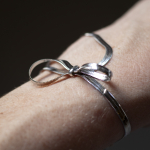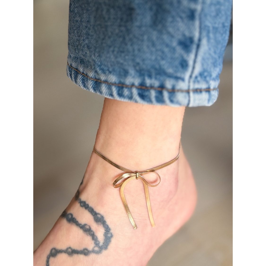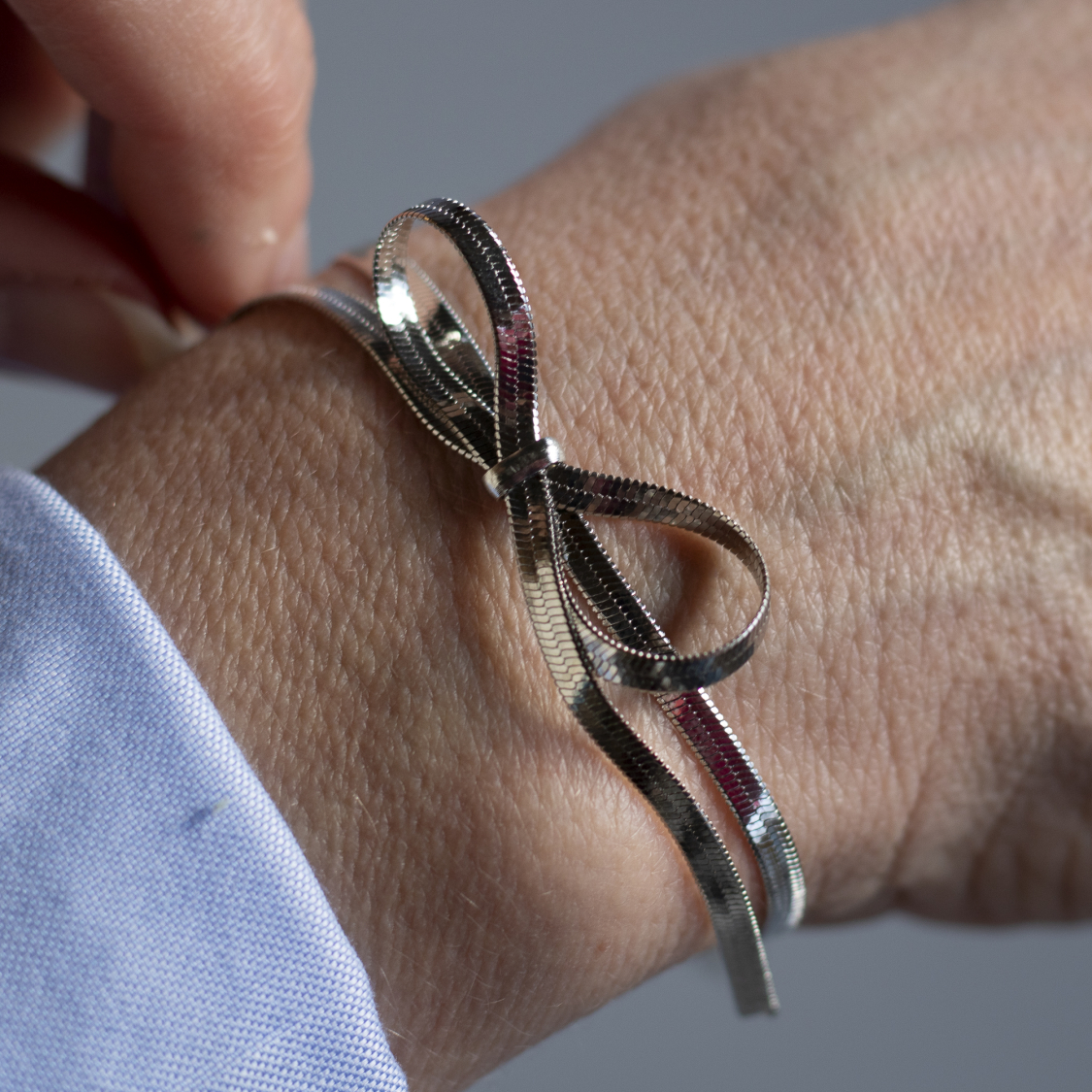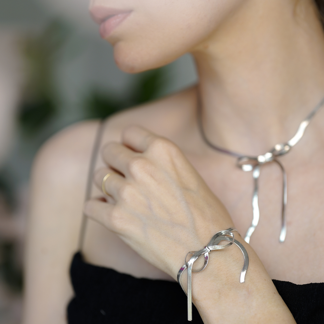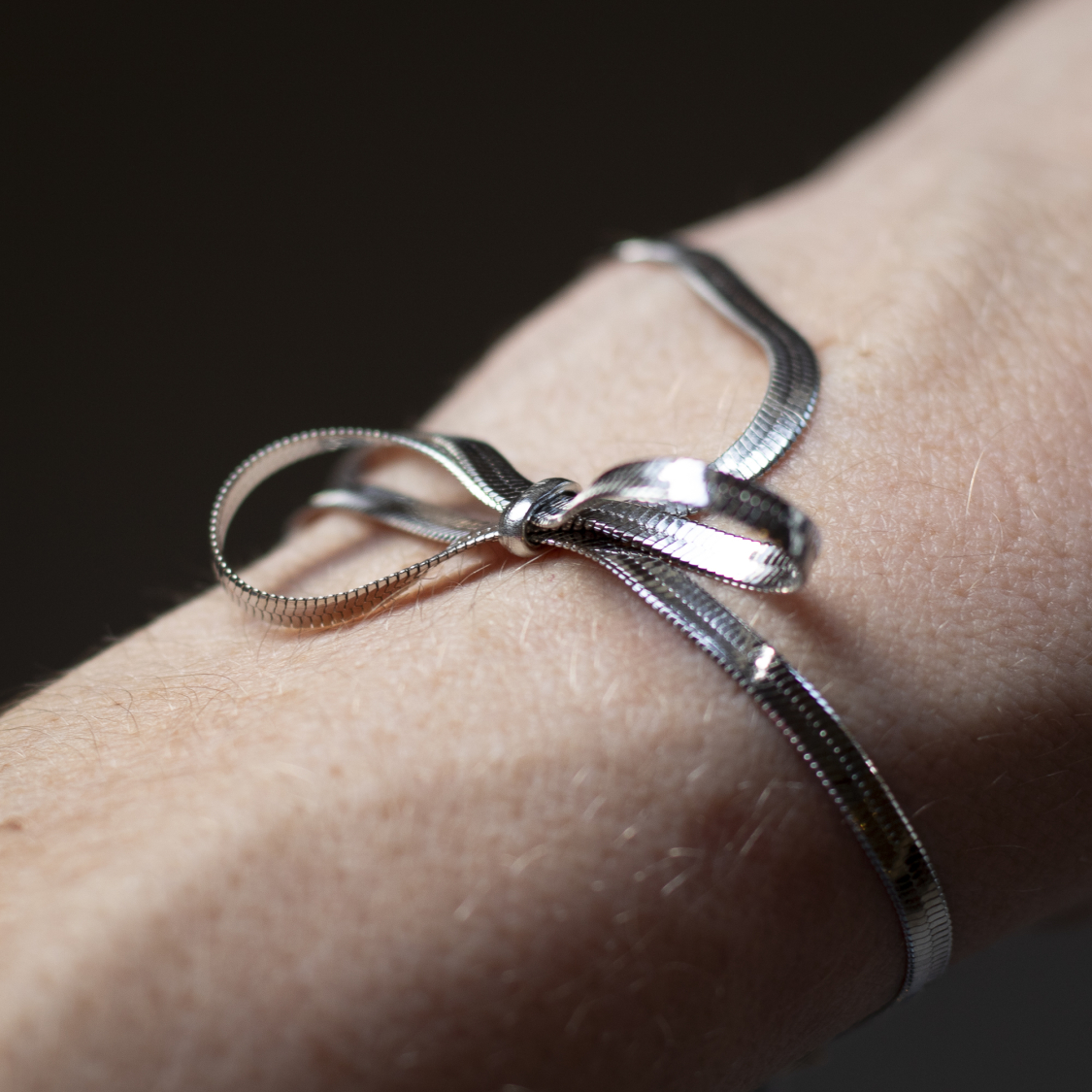 Smuk forsølvet halskæde og armbåndssæt med sløjfe. Armbåndet kan også bruges som ankelkæde. (ikke vandfast). Se mål længere nede