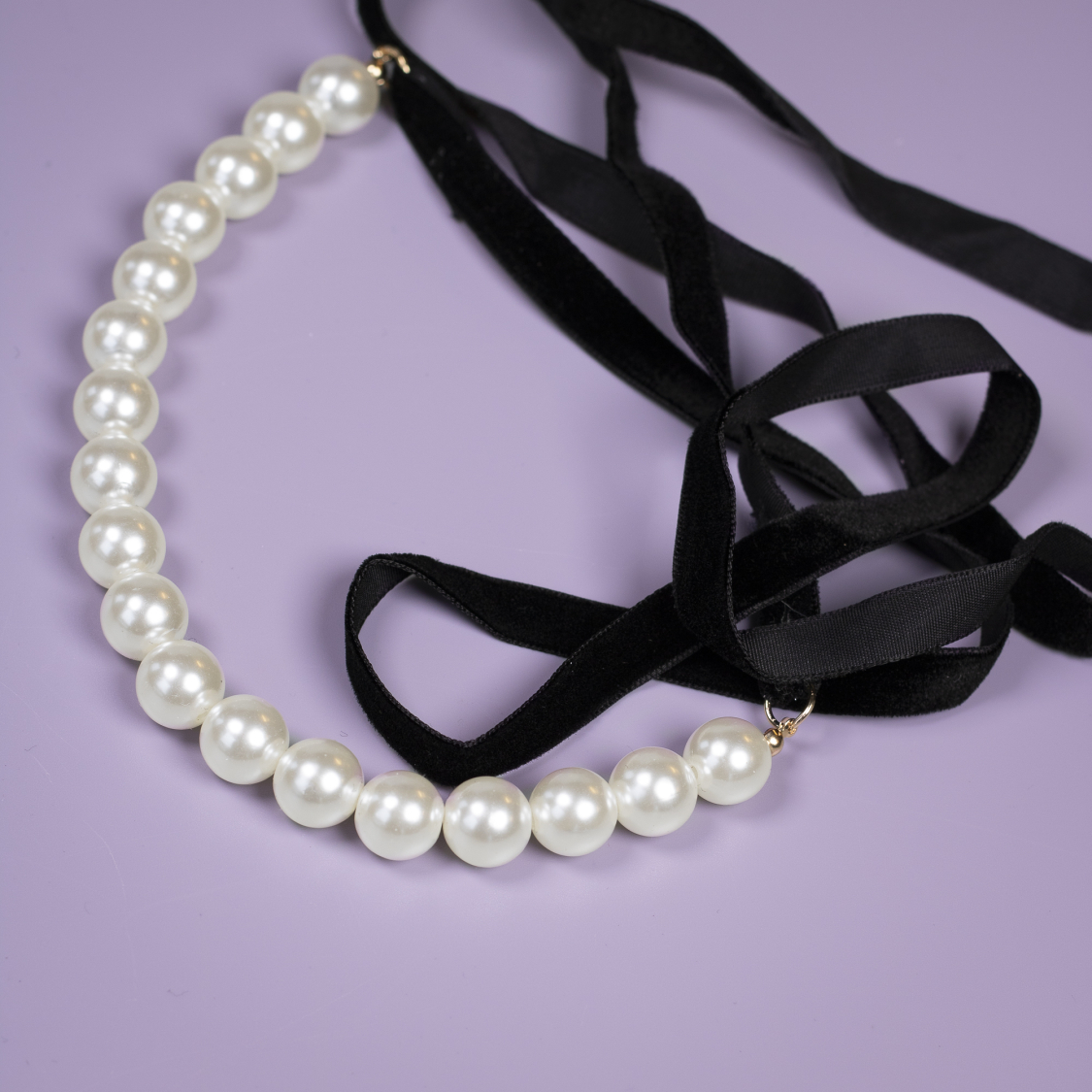 Velour halsbånd i sort med hvide perler. Båndet kan både bruges for sig selv eller du kan sætte en sløjfe på, for at skabe din egen unikke stil.