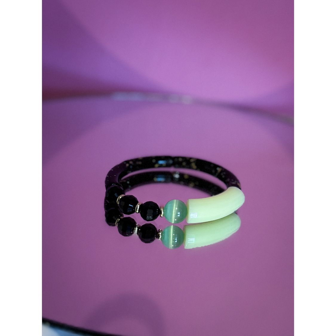 Sort og guld farvet Xia armbånd fra  LÉ MOSCH – med natursten, vist på hånd.